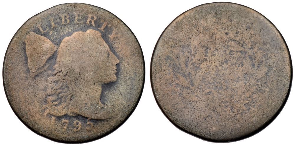 1795 S-76b R-1 AG3Mostly olive brown with deeper steel in the protected areas on rather glossy surfaces. Fairly smooth on the reverse with partial legends and a faint outline of the wreath, sharper on the obverse with clear date and LIBERTY. Certificate Number:
