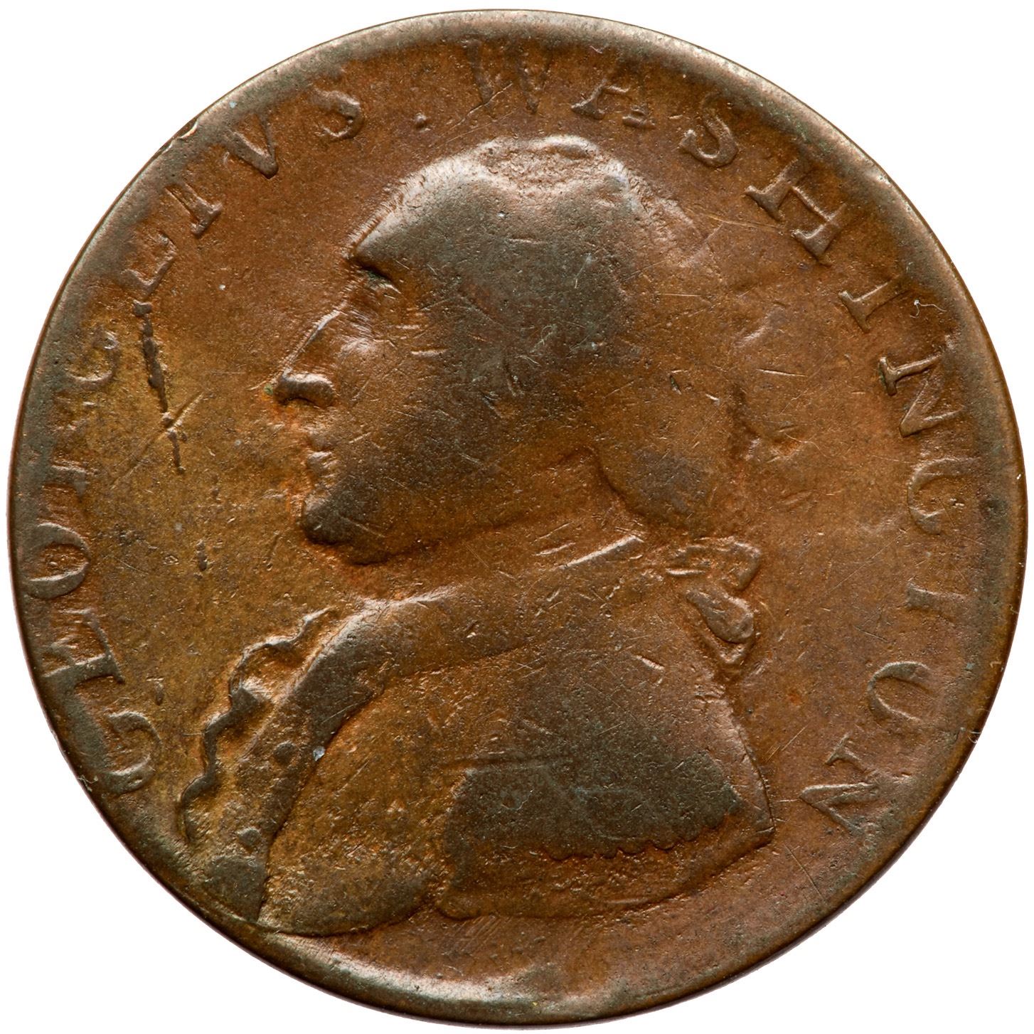 An "Evasion Copper." Very attractive glossy medium brown and light chocolate with slightly darker steel brown toning on the highpoints. The surfaces are smooth and this piece shows very little actual wear. Hints of mint frost show in protected areas on both sides. The surfaces and luster are consistent with a choice EF40 coin. The strike is typical with significant weakness in parts of the harp; hence the more conservative grade. The two stars (actually look more like fleurons) at either side of the bottom of the harp are clear. A very nice example of this popular Washington-themed evasion copper that has a separate listing in the "Redbook." Weight 89.0 grains.