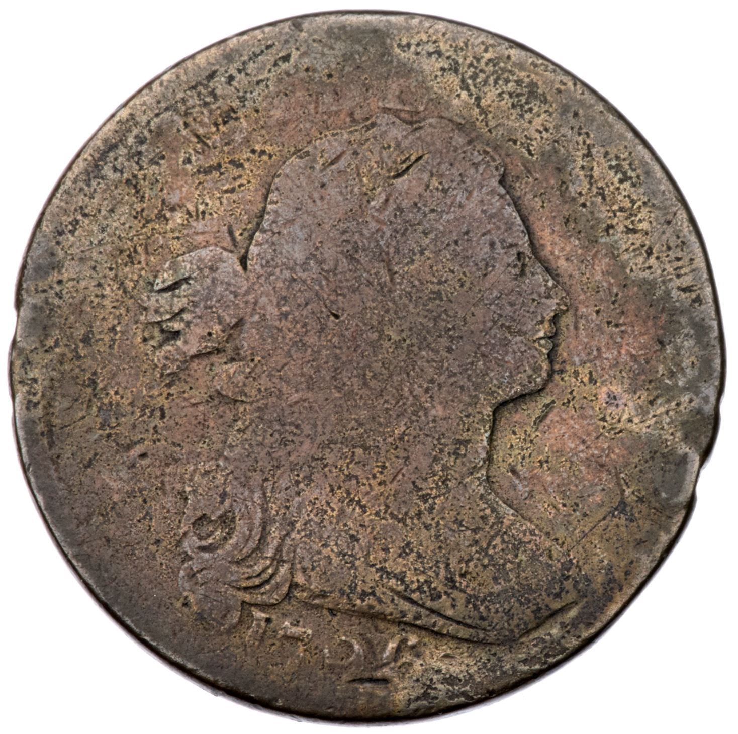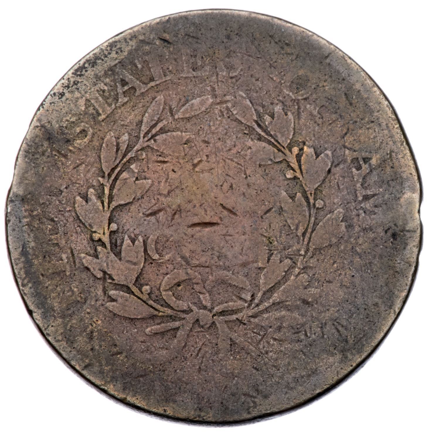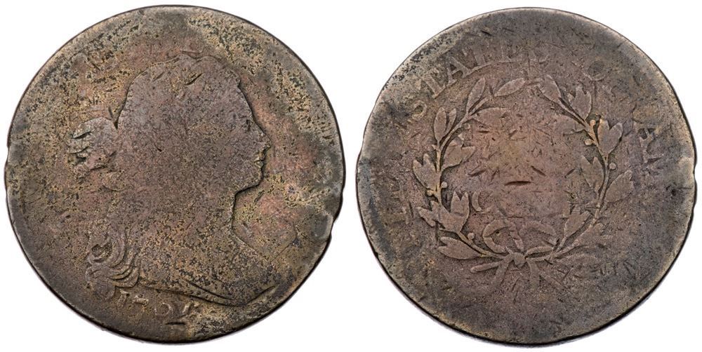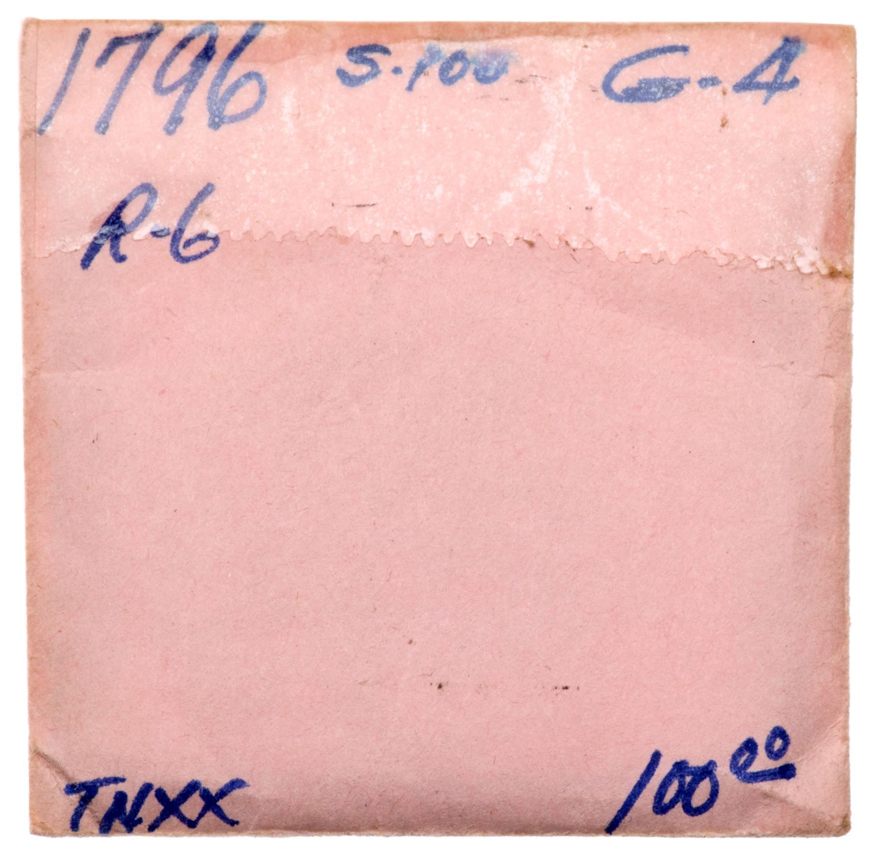 1796 S-100 R-5 AG3Deep olive and medium brown with golden olive tones on the obverse. There is also very light microporosity on the otherwise glossy obverse surfaces. There are a few notable rim bruise at K-3 and K-9 on the obverse. Readable date and outlined devices. EDS.Certificate Number: