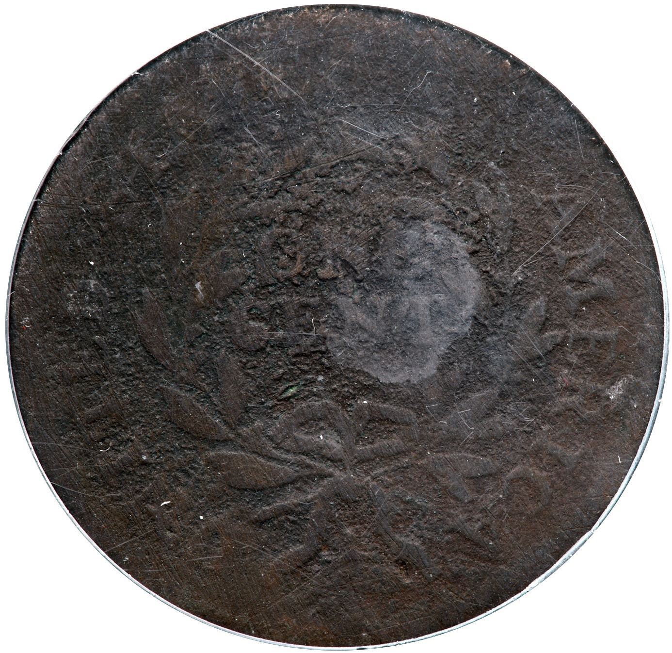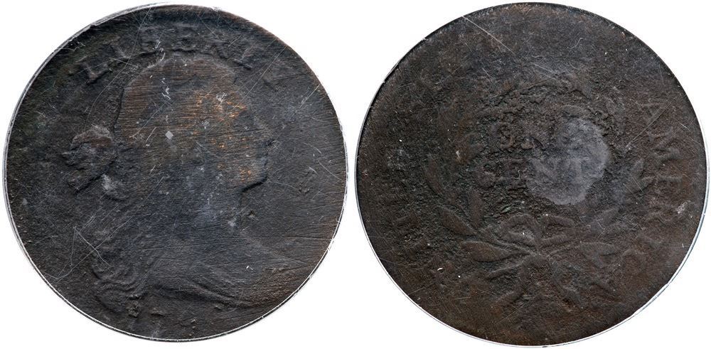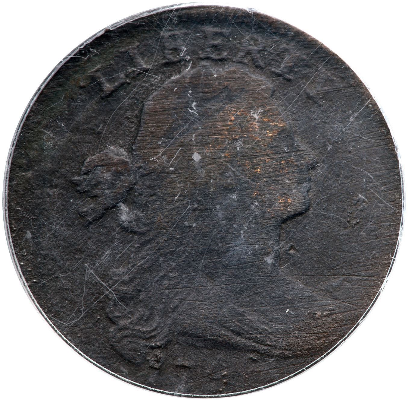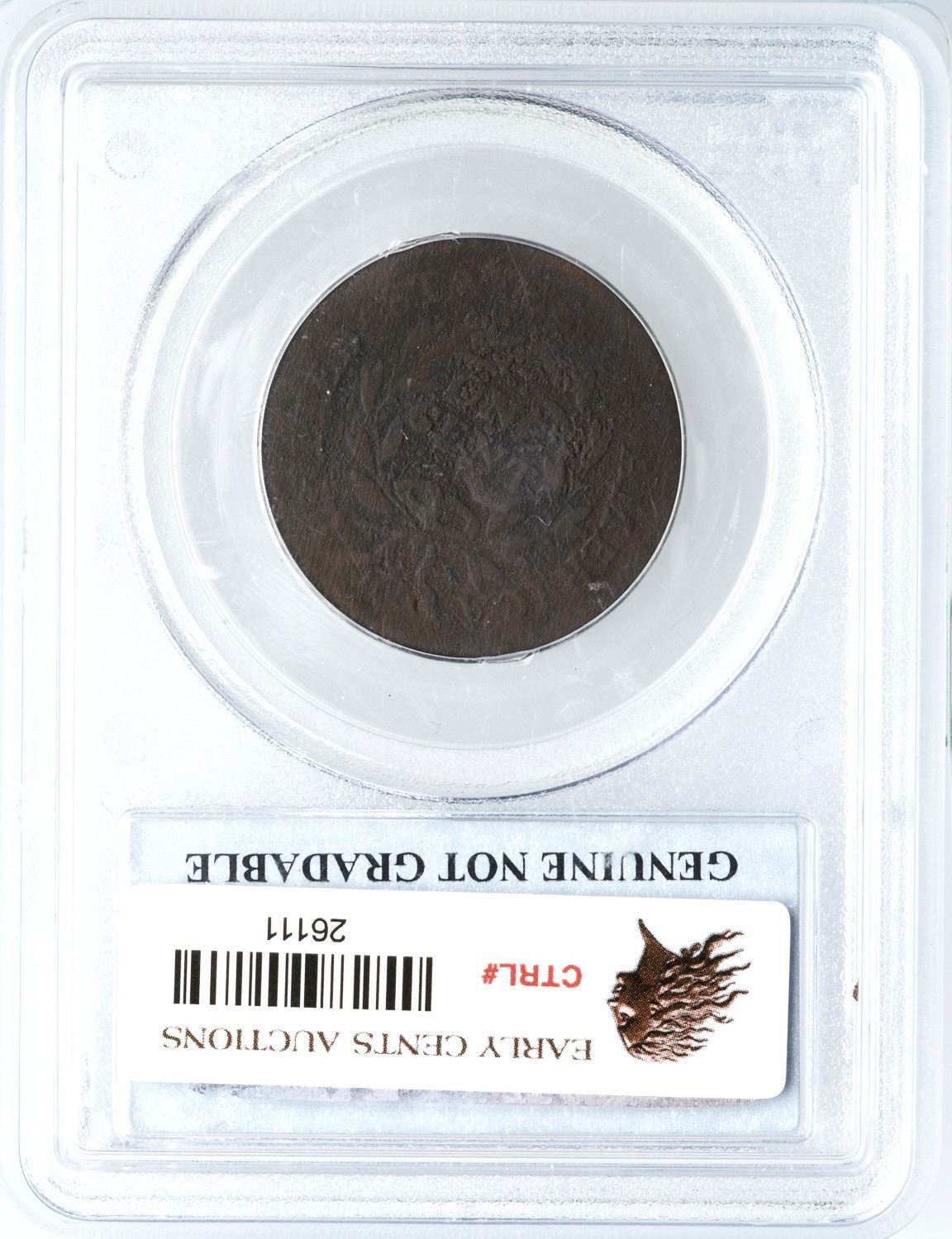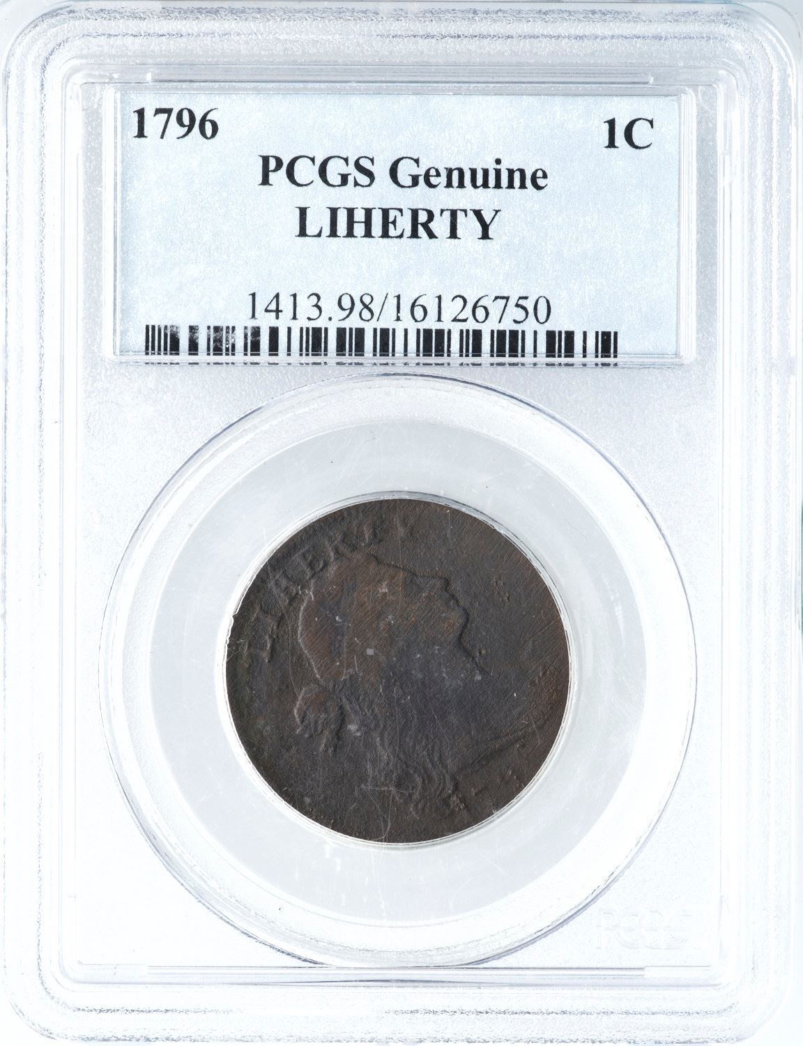 1796 S-103 R-4+ LIBERTY PCGS GenuineG5 sharpness but there is fine roughness and microporosity in some of the protected areas. There are also a couple notable digs atop TE and right of the last S in STATES, though whatever earned the "RIm Damage" qualifier by PCGS is hidden by the holder. Mottled chocolate and dark brown surfaces. Despite the minor surface issues the date is fully readable, as are most of the legends. Our grade is AG3.Certificate Number: Certificate # 1413.98/16126750