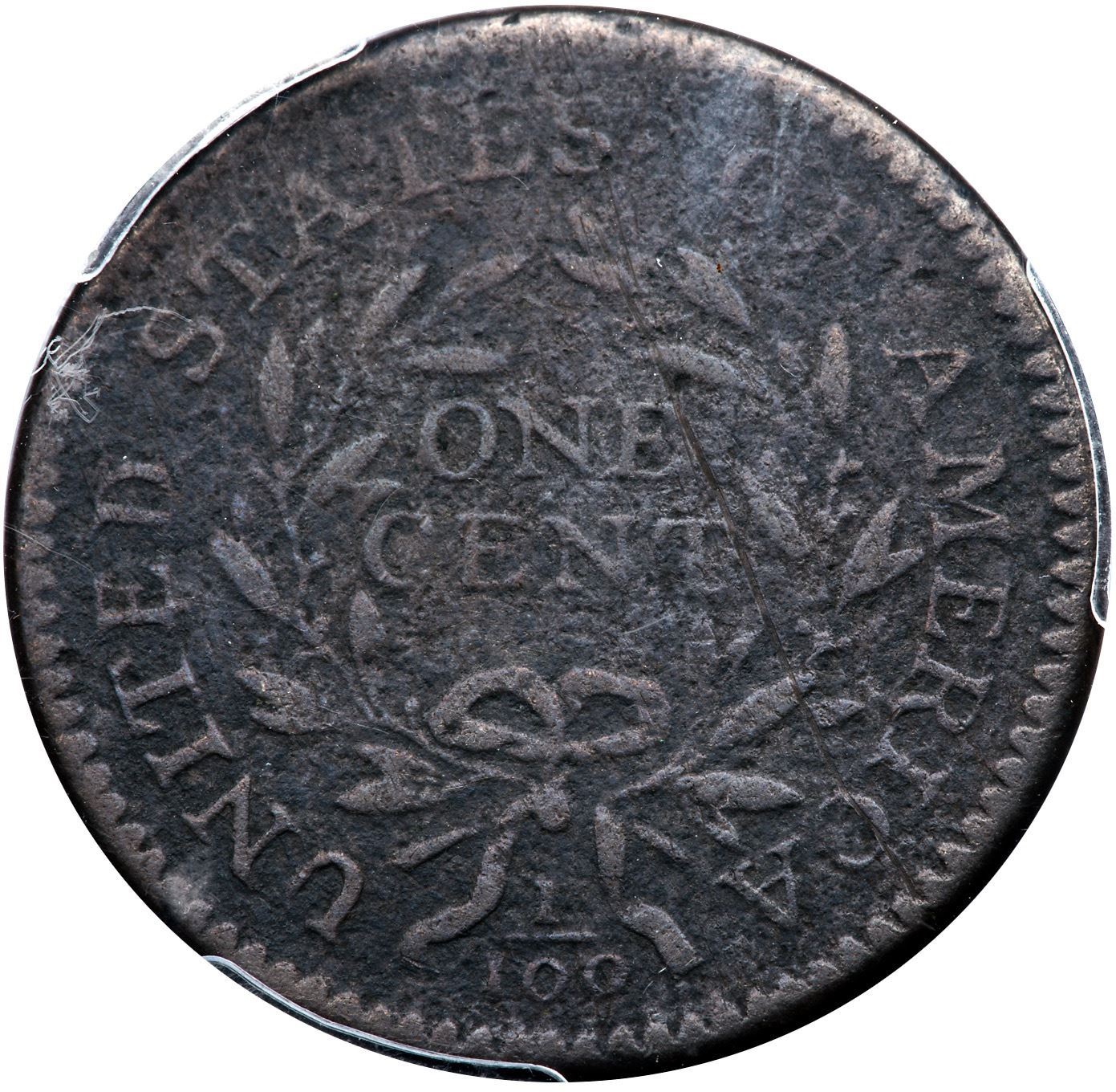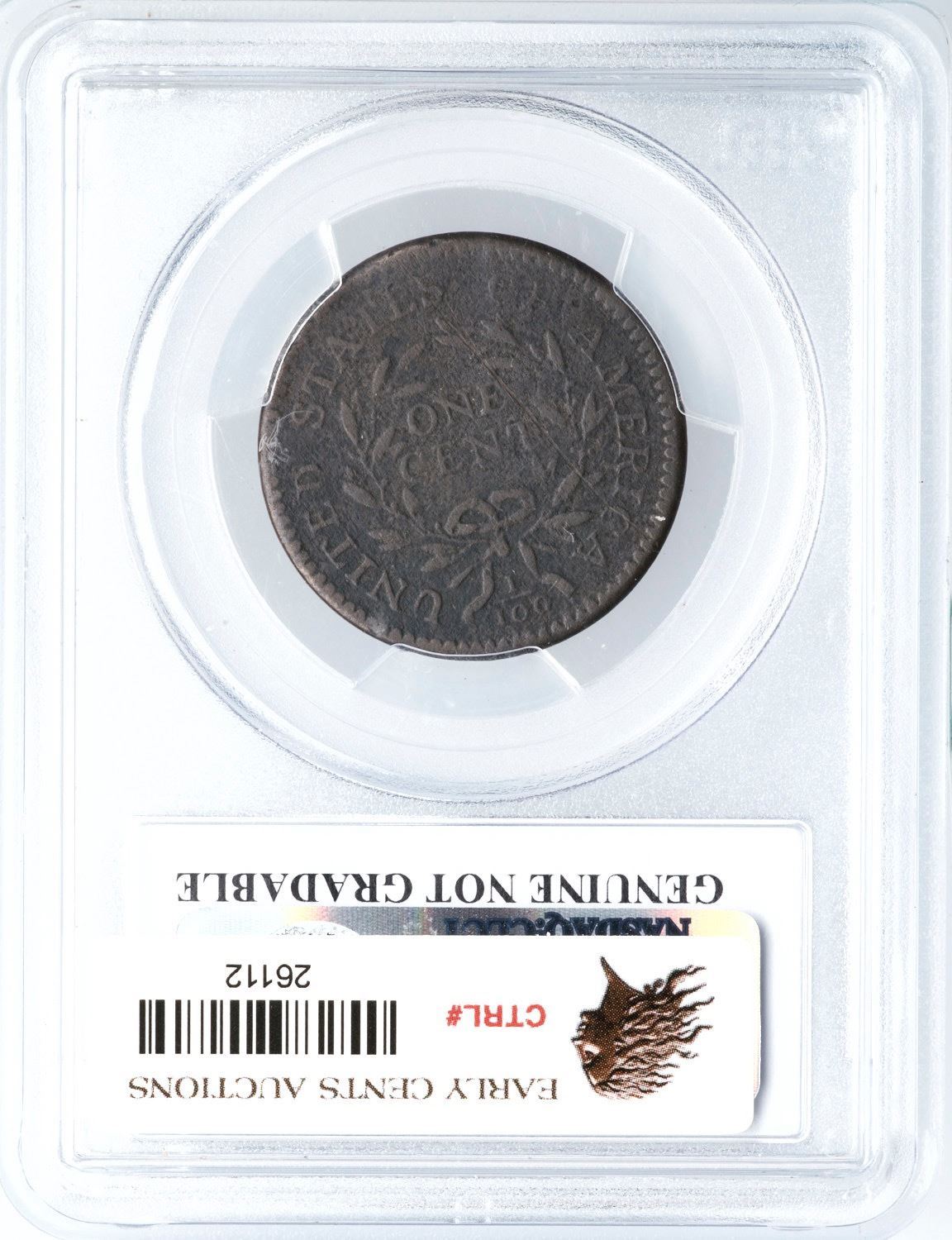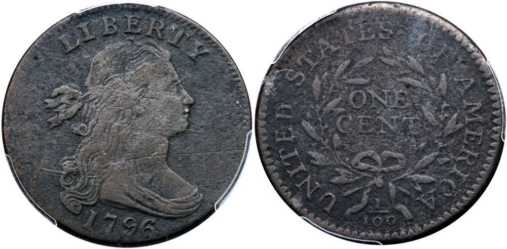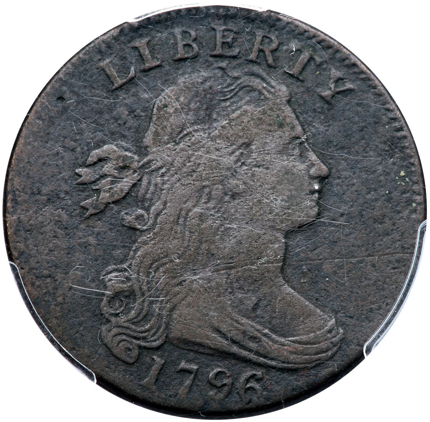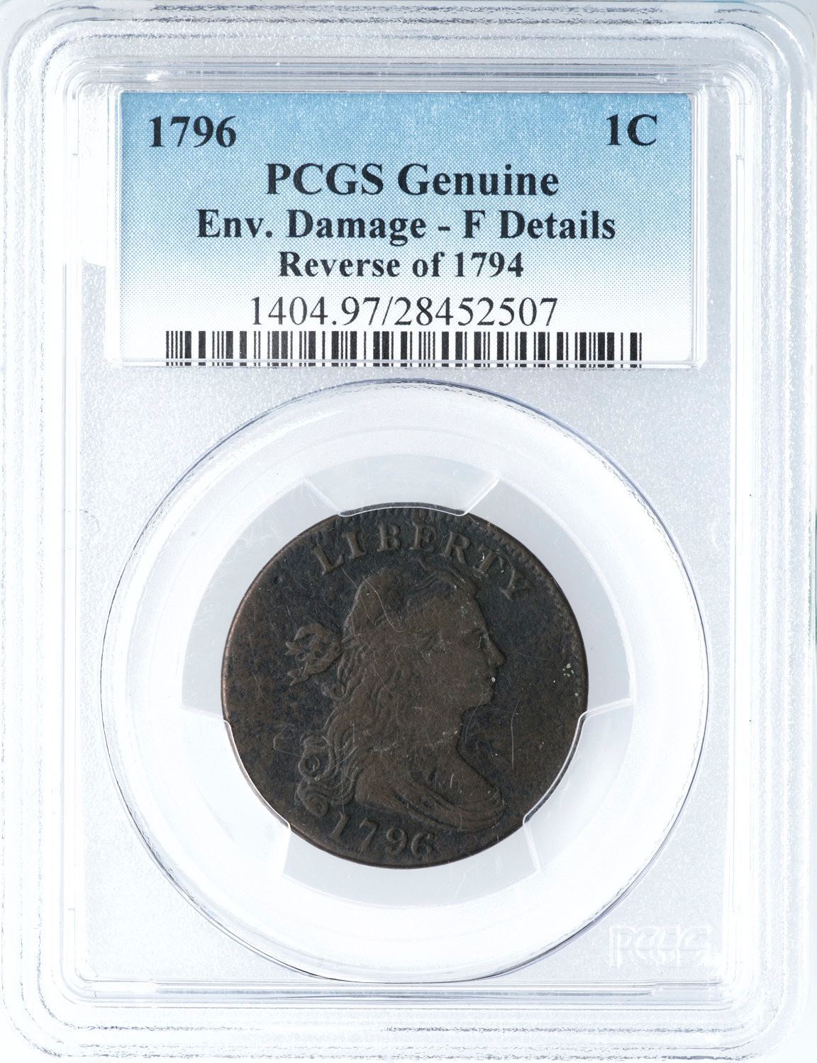 1796 S-110 R-3 PCGS F Details (Env. Damage)VG10 sharpness but there is fine roughness and microporosity on the surfaces. There are also horizontal hairline scratches across the portrait, the most notable through the neck into the right field and a diagonal one on the central reverse right of ONE CENT. Olive brown, dark chocolate, and dark steel patina. Bold date and LIBERTY, full reverse legends. Our grade is VG7.Certificate Number: Certificate # 1404.97/28452507