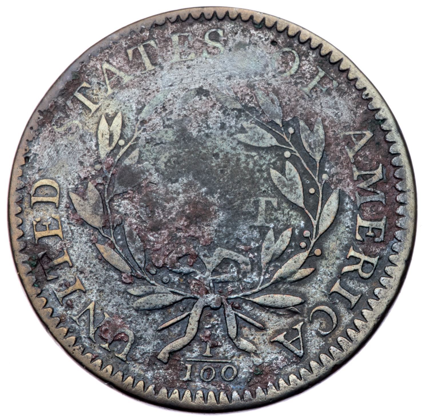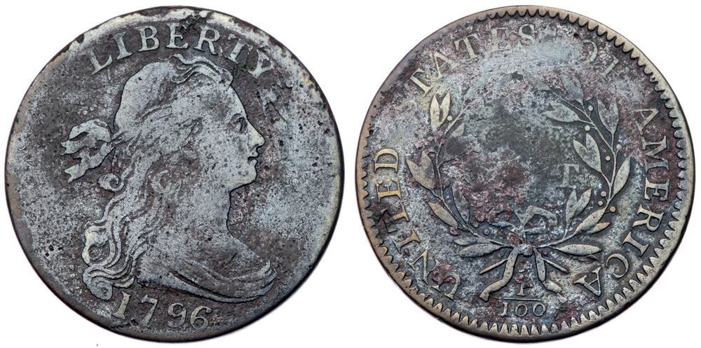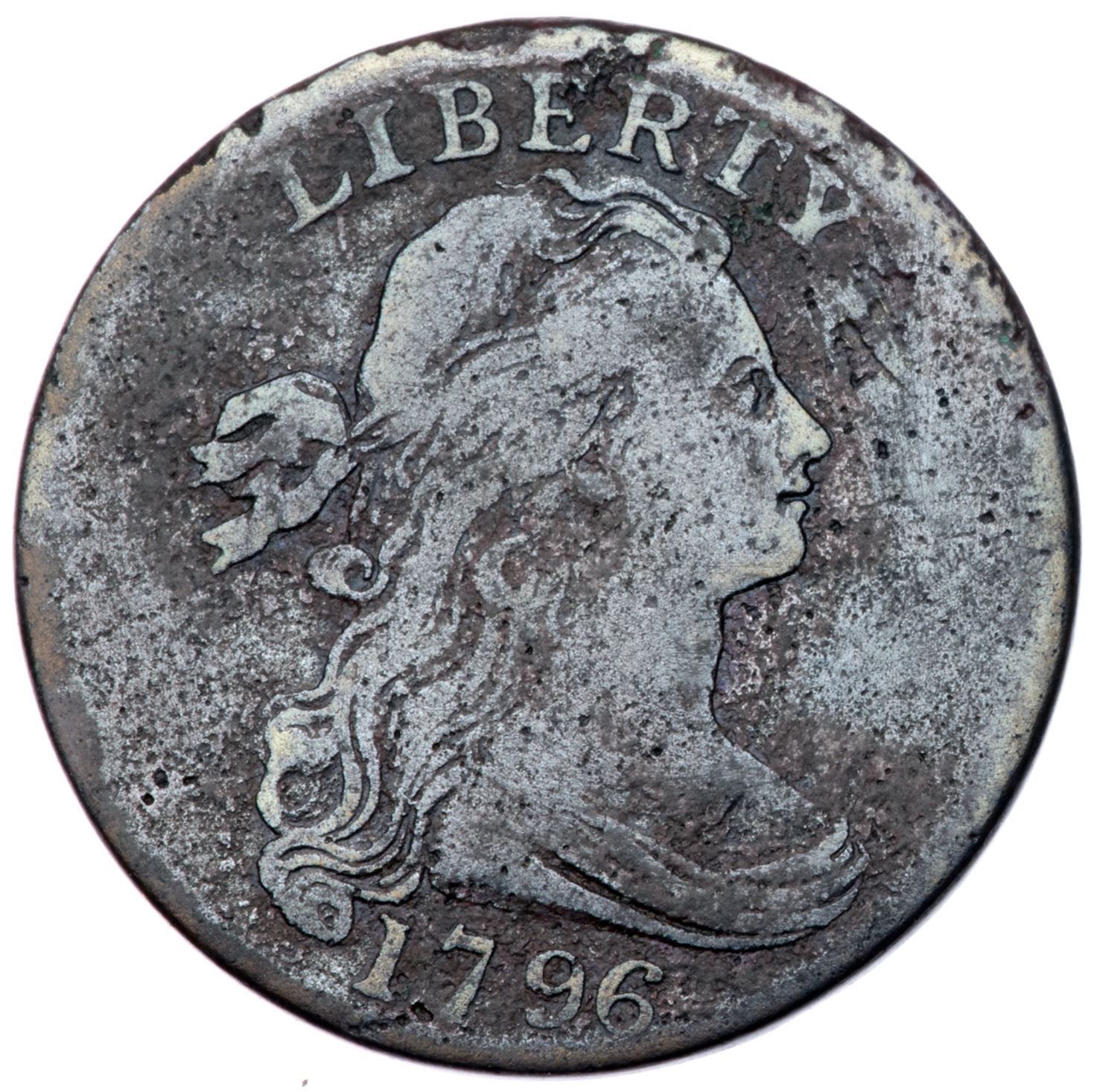 1796 S-112 R-4+ G6VG10 sharpness but corroded with fine roughness and very light microporosity on the surfaces, as well as old verdigris in some of the protected areas. Glossy deep steel and dark brown surfaces. Full date and LIBERTY, M-LDS with the central bulging obliterating ONE CENT but peripheral legends remain readable.Certificate Number: