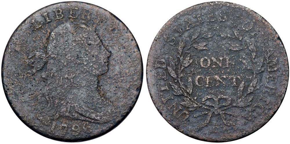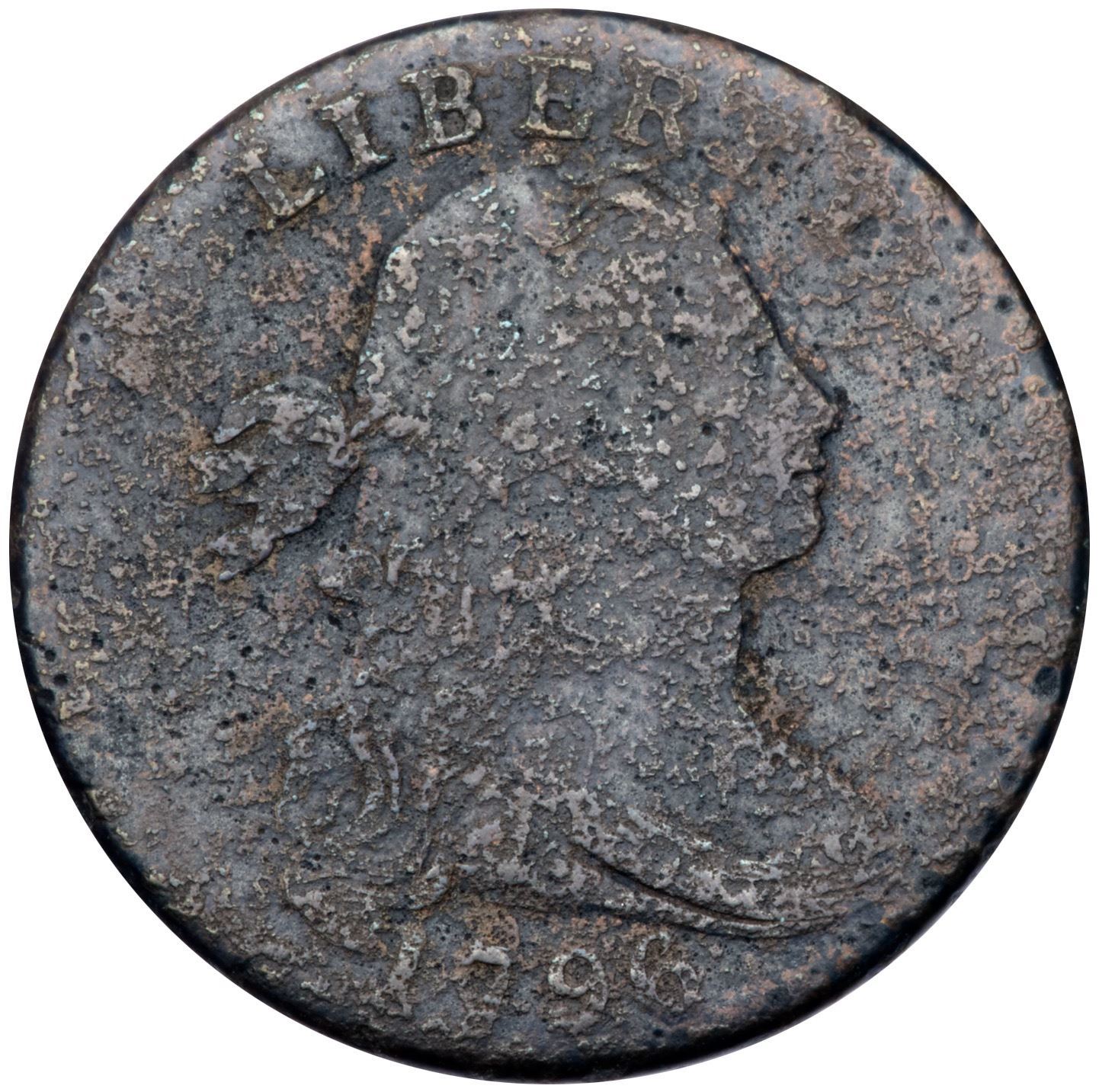 1796 S-116 R-5- AG3VG sharpness but corroded with granular surfaces. Despite that, there are no visible marks and the date and legends are complete and easily readable. Mottled dark brown and ebony patina. Certificate Number: