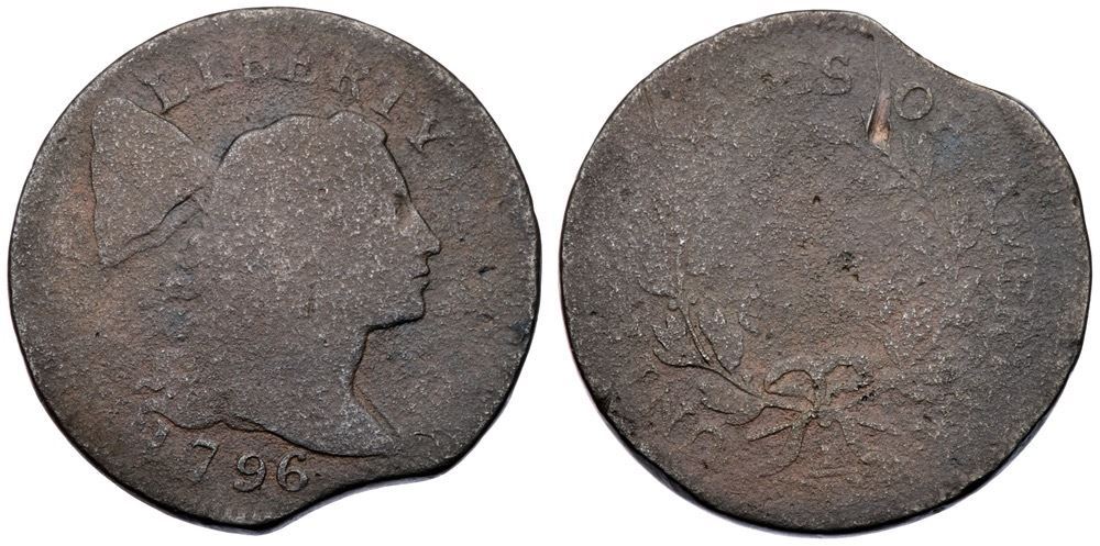 1796 S-83 R-4 Clipped Liberty Cap AG3A couple points sharper but uniform granularity covers the surfaces and there is a notable dig under O in OF up to the dentils. The only other notable mark is a rim bruiseat UN in UNITED, and the planchet is also clipped right of the date. Bold date and LIBERTY. E-MDS, Breen state II early. Certificate Number: