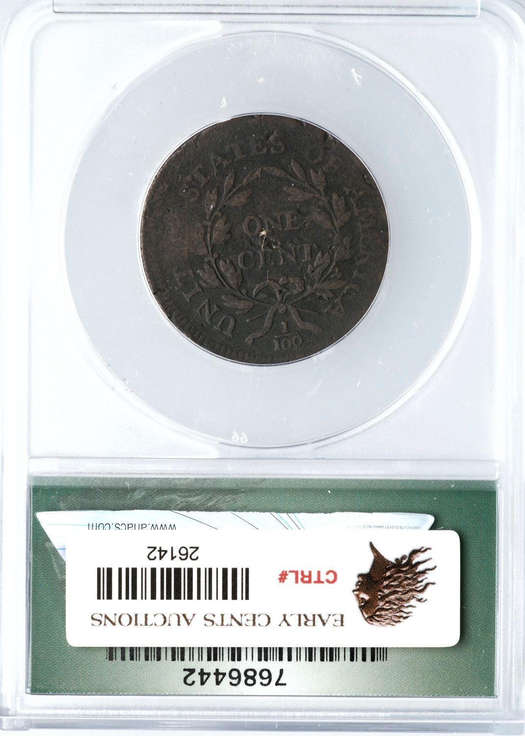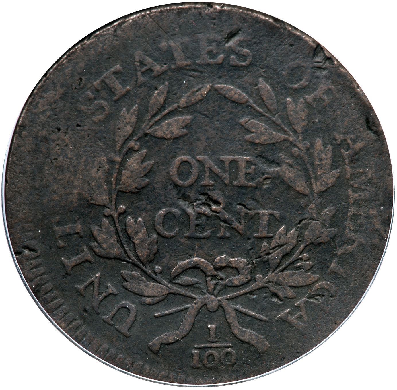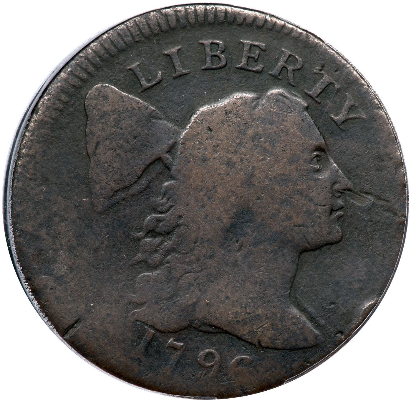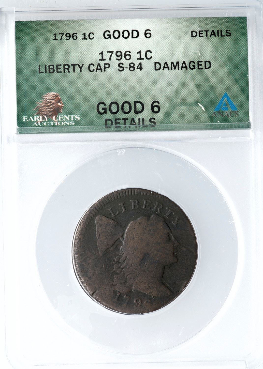1796 S-84 R-3 ANACS G6 Details (Damaged)G6 sharpness but there are notable digs before the nose as well as on the reverse atop EN in CENT and over ES OF A. There is also a small scratch at K-7.5. Semi-glossy dark olive brown, a few shades lighter on the devices. Struck slightly off center towards K-3. Our grade is G4.Certificate Number: Certificate Number# 7686442