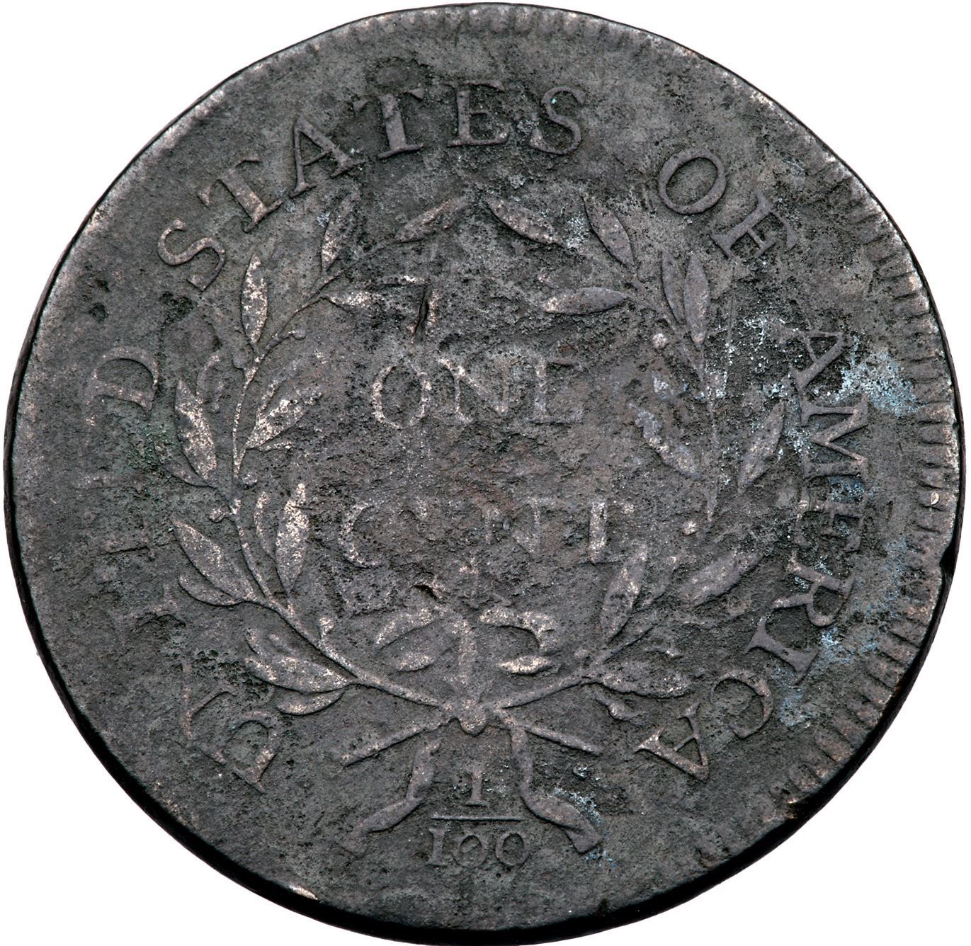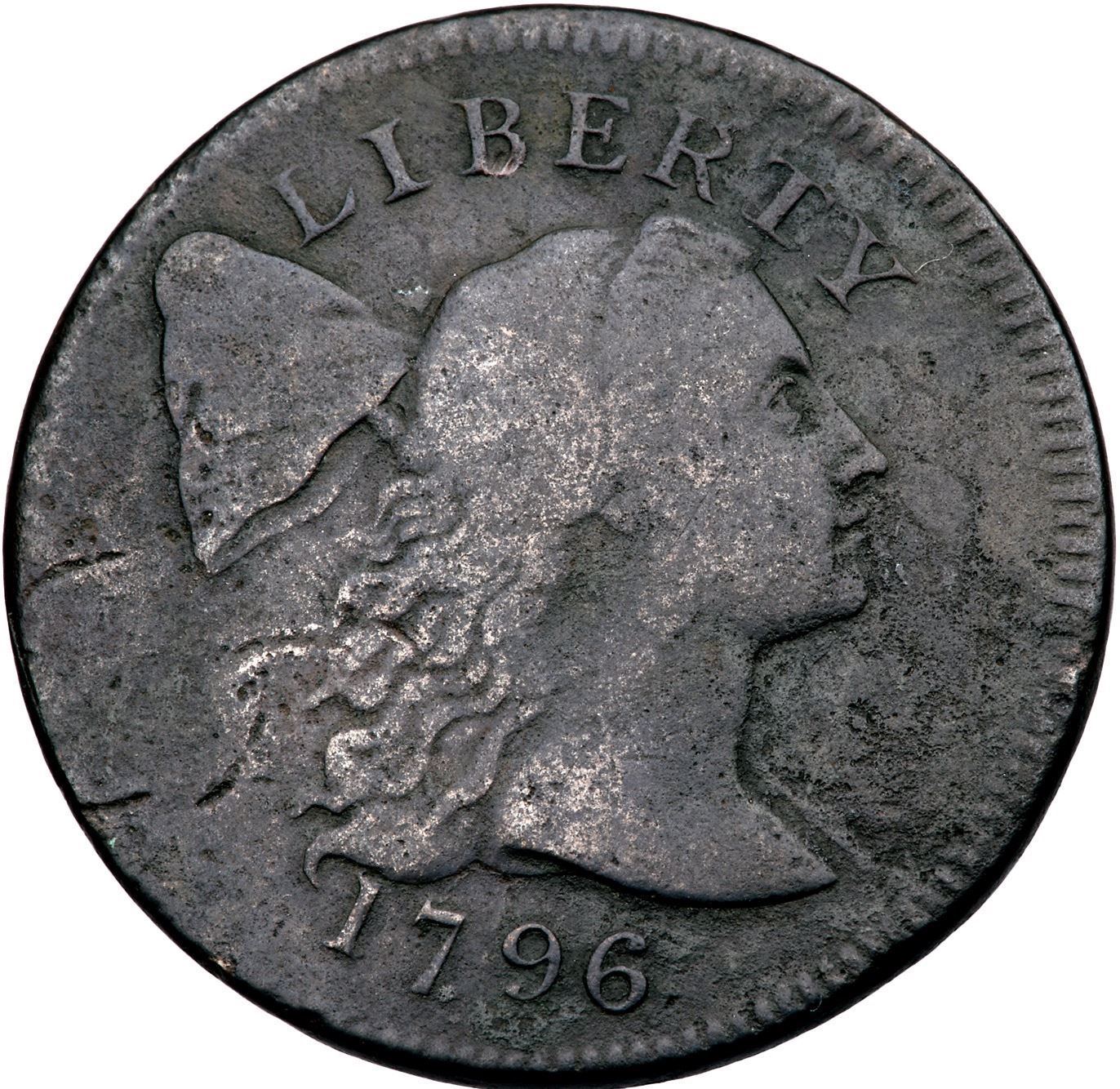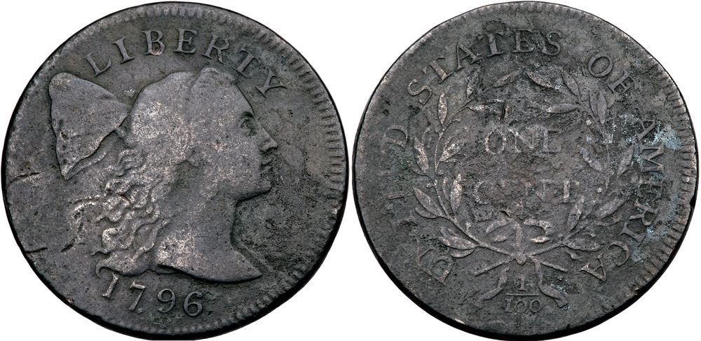1796 S-86 R-5 VG7A few points sharper but slightly corroded dark scale in some protected areas. There are minor nicks in the left obverse field, and a couple above ON in ONE. Deep charcoal and olive patina. Strong date, full legends. Certificate Number: