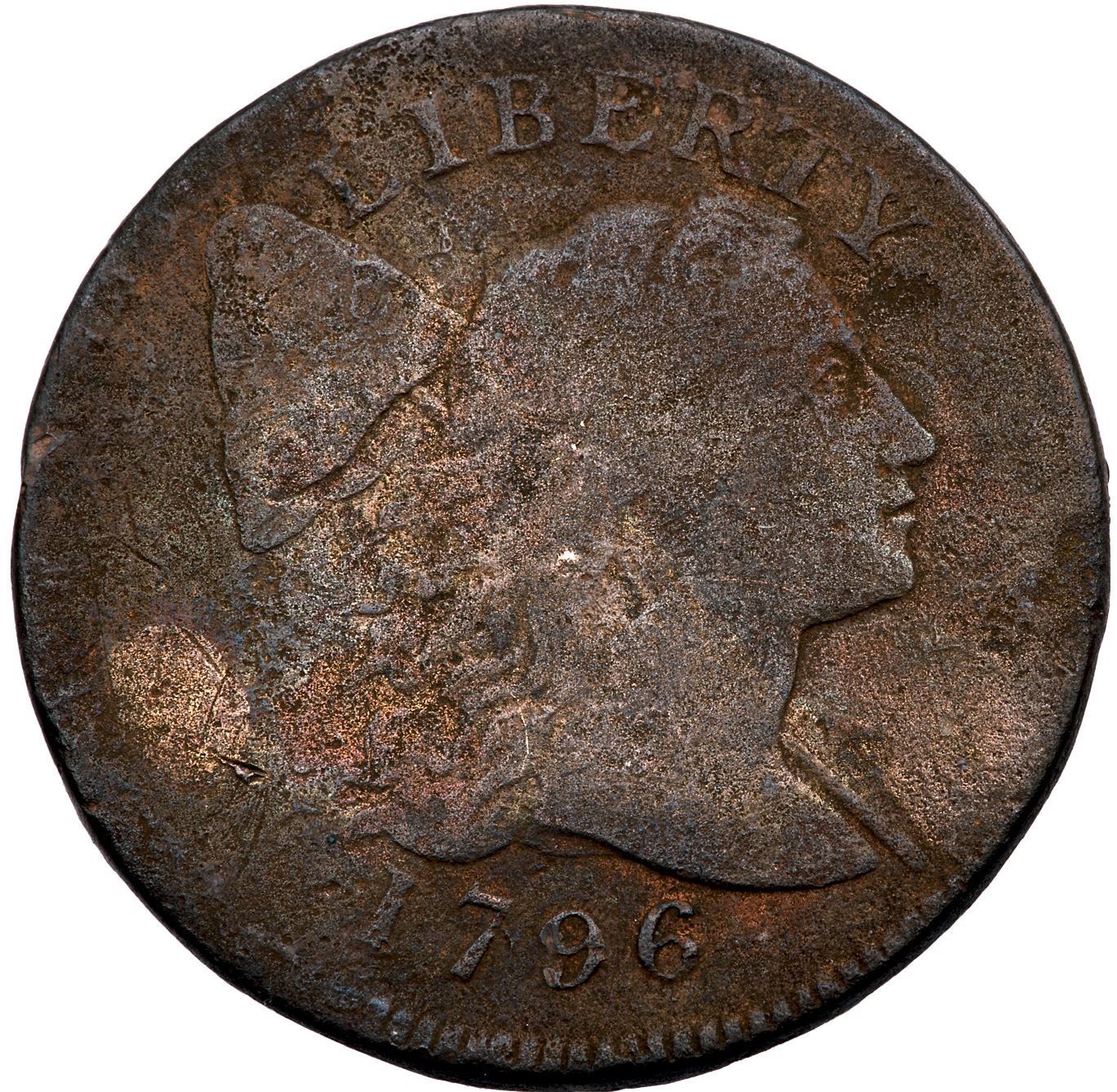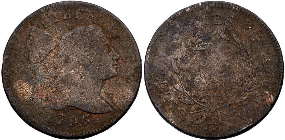 1796 S-91 R-3 Liberty Cap AG3Near fine sharpness but corroded and cleaned with fine to moderate granularity on the surfaces. Mostly dark brown and steel with faded rose and orange tones underneath. Strong date.Certificate Number: