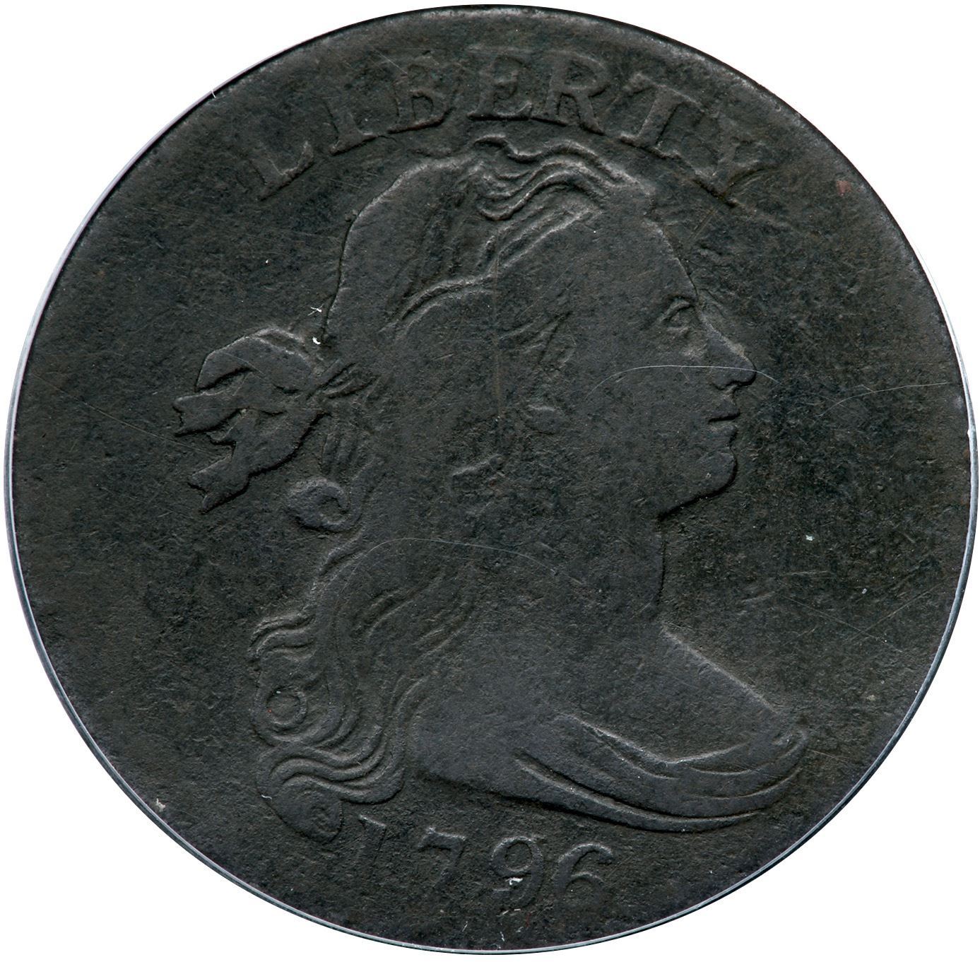 1796 S-92 R-3 ANACS VG10 Details (Corroded, Scratched)VG sharpness but there are traces of microgranular scale and verdigris in some protected areas, as well as numerous nicks all around the reverse rims. There are also old hairline scratches over ST in STATES, inside the left wreath, and one through the portrait. Deep olive green patina. Full date and legends. Our grade is G4.Certificate Number: Certificate Number# 7686448