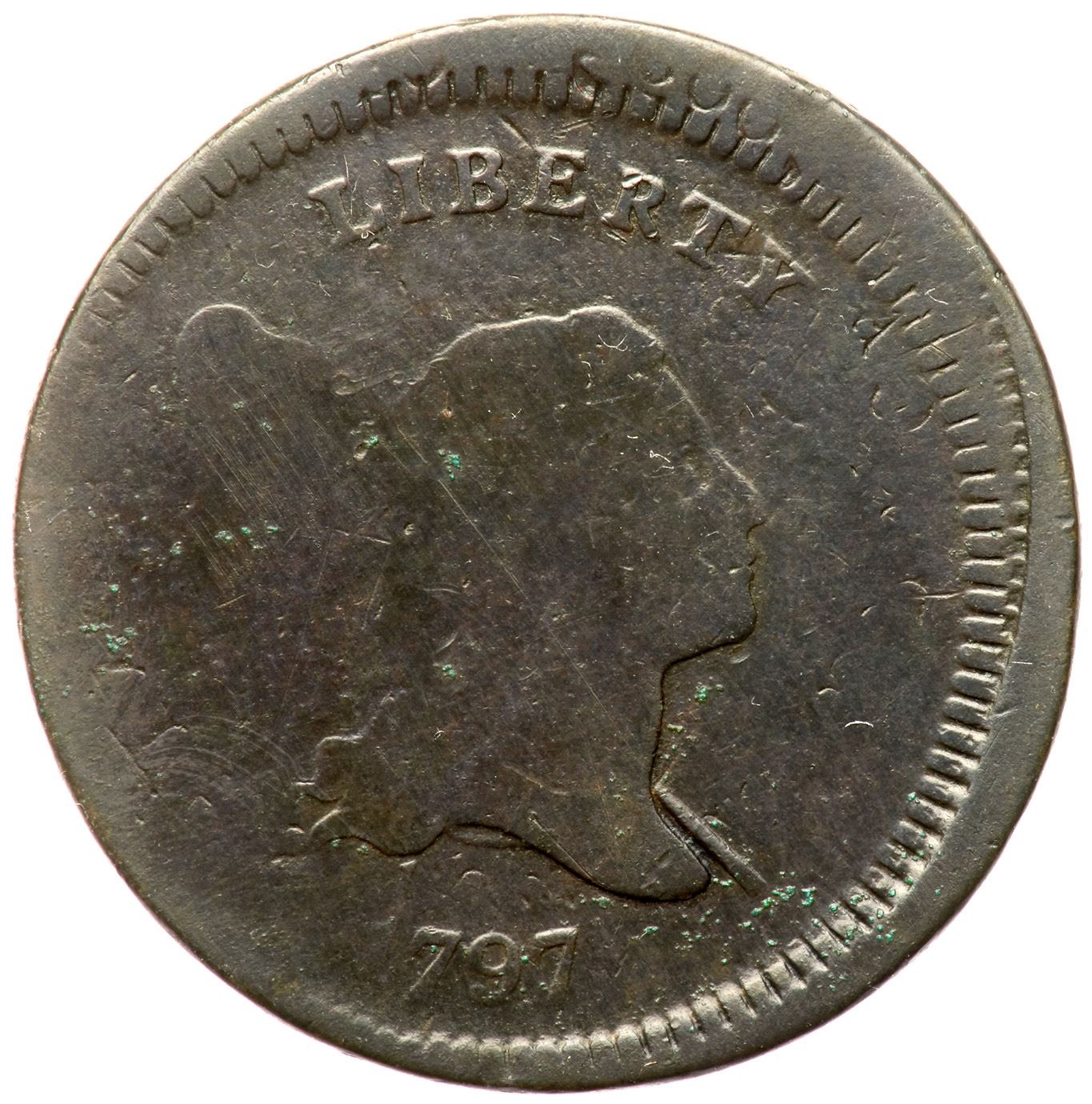 Glossy olive brown and steel. Mostly smooth, just well worn with a few small contact marks. The obverse is a bit more detailed than the reverse, perhaps a 5/3 split. The date is clear and the 1 Above 1 feature is obvious. Early die state before any die cracks on the obverse. What makes this piece special is that it was struck twice. The first strike was a brockage impression of the reverse that was slightly off center; the second strike was normal but a bit off center to K-8. Incuse elements from the brockage impression are clearly visible on the obverse, particularly the denominator above ERT and ATES left of the lower curls. The only evidence of a first strike on the reverse is at AM, but the low grade probably accounts for the lack of an undertype (which should be a normal reverse).