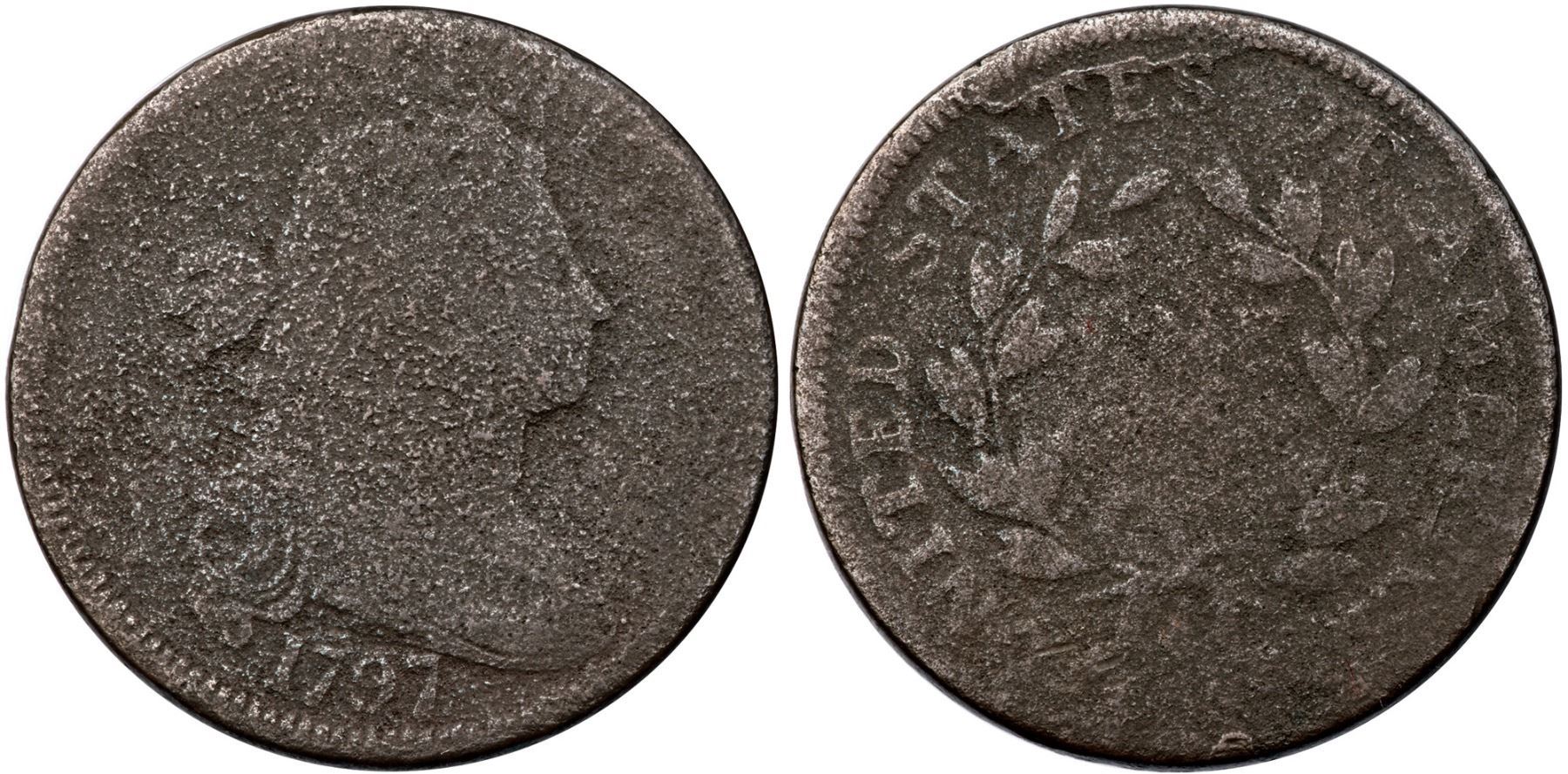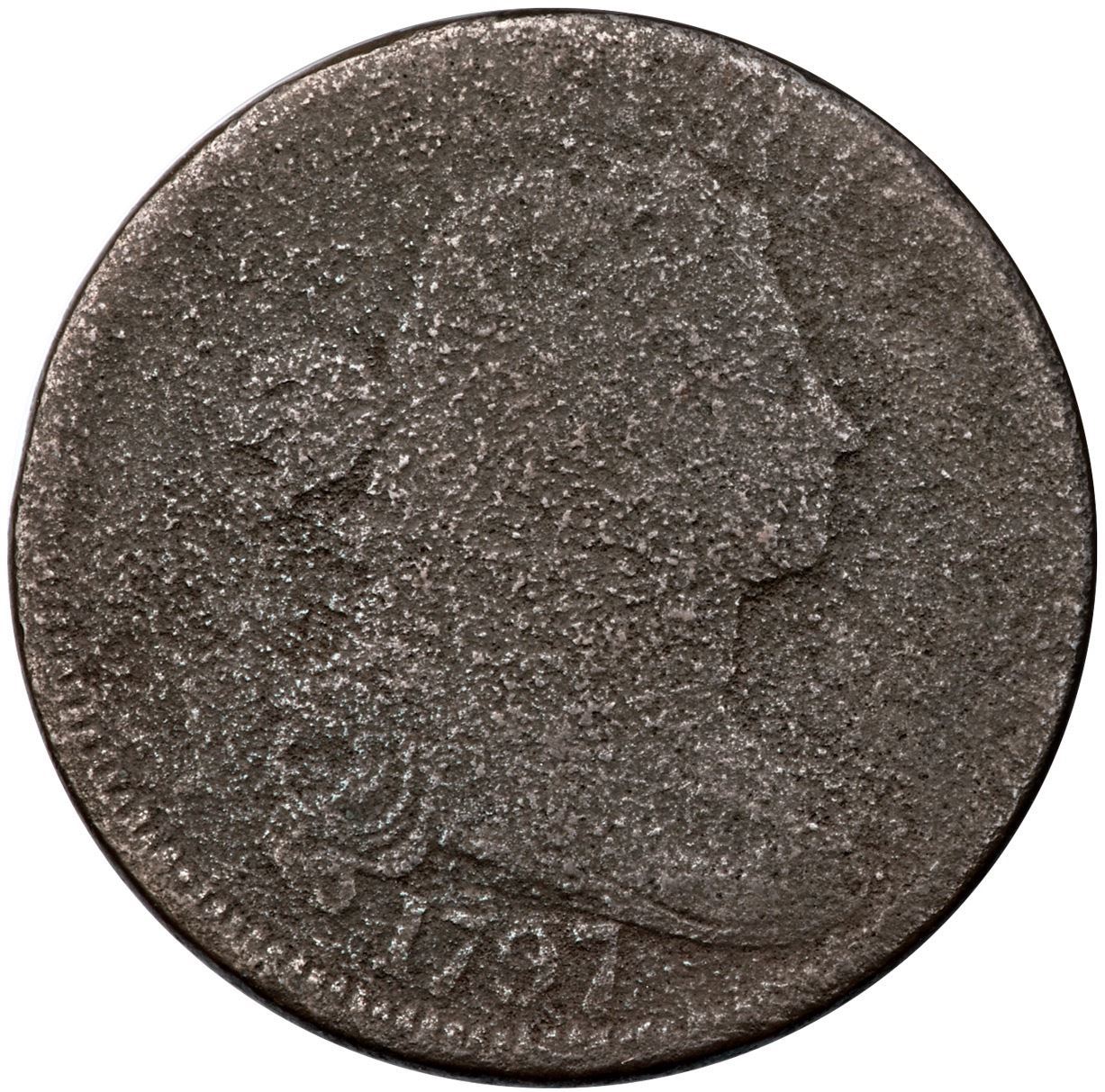 1797 NC-3 R5+ Fair-2+Slightly sharper but covered with fine to moderate granularity. No verdigris or marks. Medium steel brown. The details at the bottom of the obverse and top of the reverse are relatively strong because the dies were out of proper axial alignment (die faces not perfectly parallel). Extremely rare M-LDS, Breen state II, with a strong die crack through the top of TES to the rim, and the section outlined by the crack is just starting to rise as a retained cud. Only 3 examples with the crack are known to us. Graded net AG3 and tied for CC#2 honors behind the VG10 example in the ANS Collection in the Noyes census, his photo #26336.Certificate Number: Pedigree: From the Fred H. Borcherdt Collection