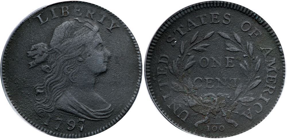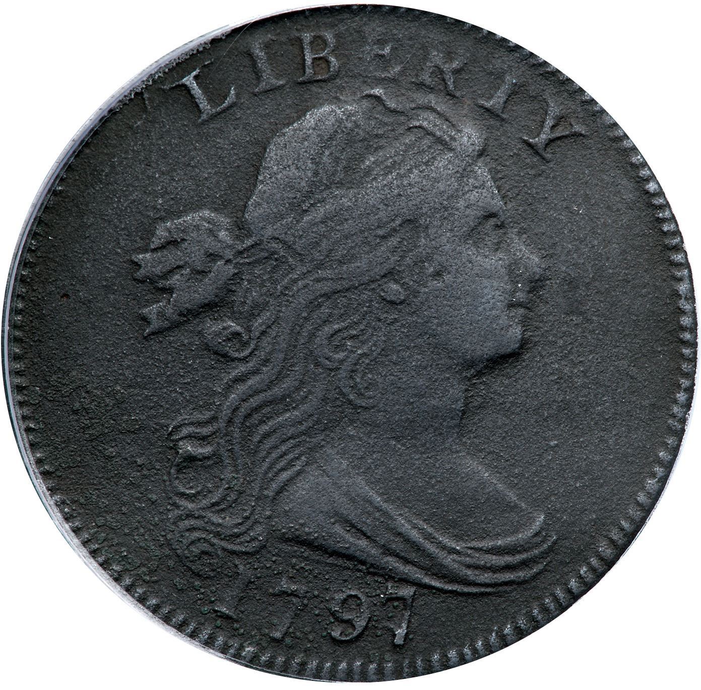 1797 S-120b R-2 Gripped Edge ANACS VF30 Details (Corroded, Scratched)VF30 sharpness but the surfaces are covered in most uniform granularity, a little stronger around the date with notable corrosion around the lower wreath and ribbon. There are also faint hairlines on the central revers that blend in well to the deep steel gray patina. Bold date and legends. There is a fine die break along the tops of LIB. Our grade is VG10.Certificate Number: Certificate Number# 7803782