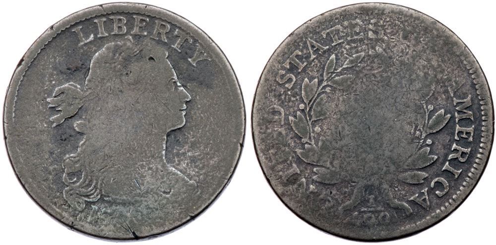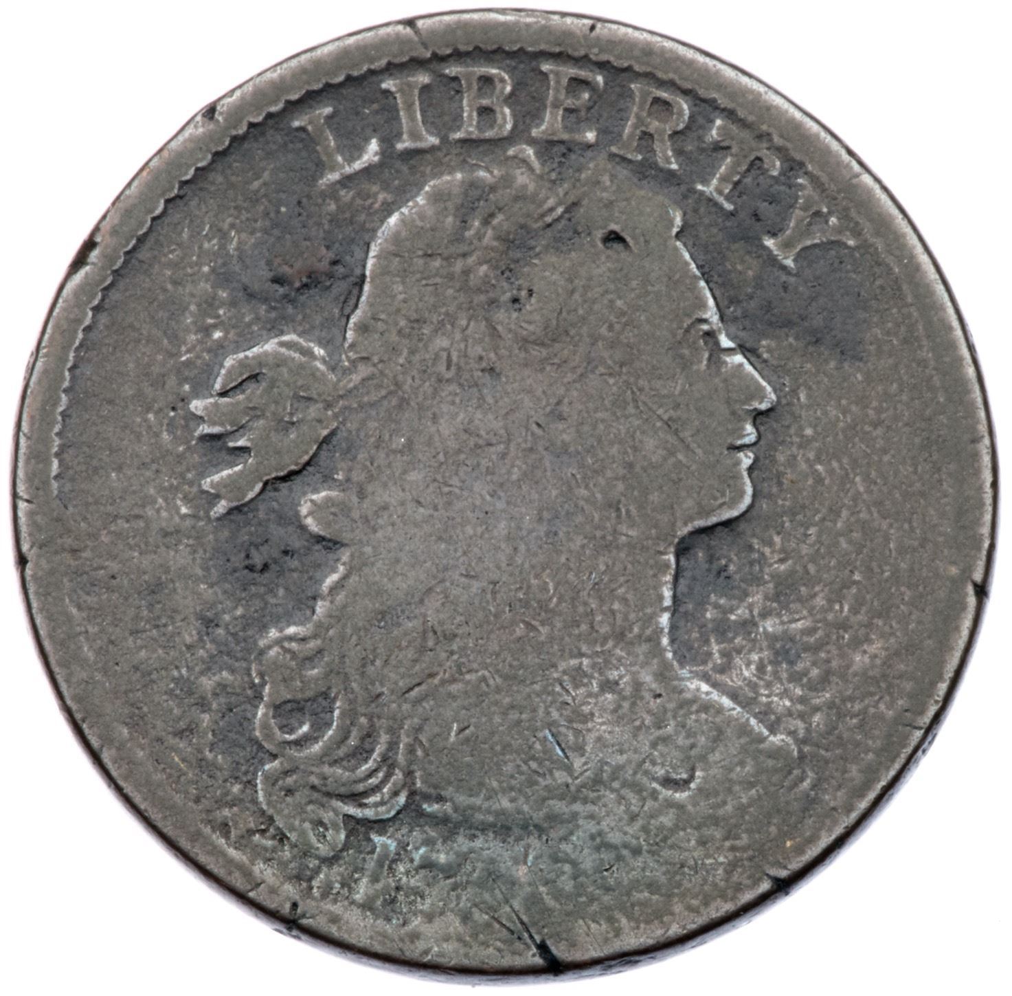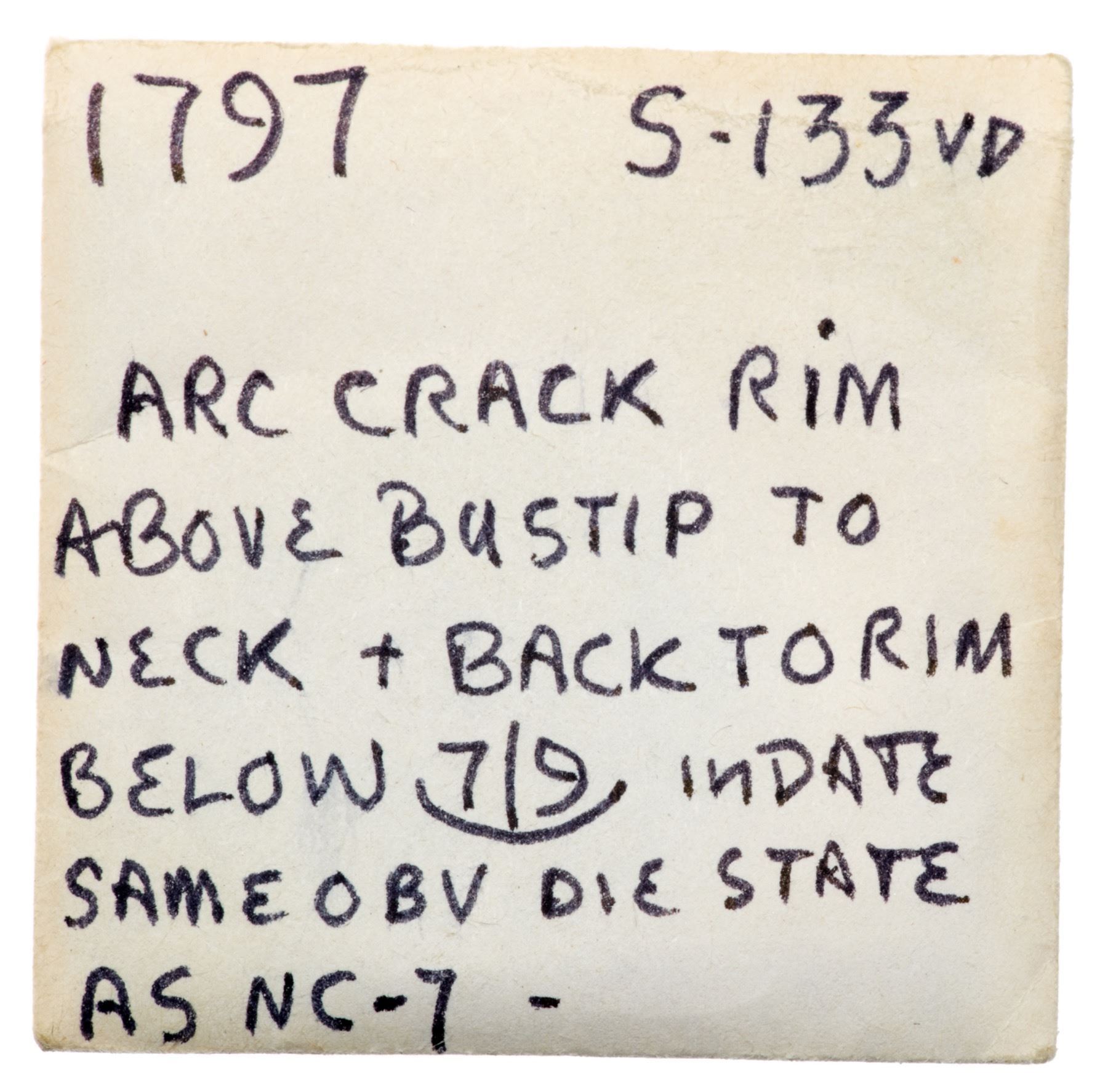 1797 S-133 R-5 AG3A point or so sharper but there is light roughness on the surfaces and traces of old verdigris in some fields and protected areas. There are also minor nicks around the obverse rims, as well as a scratch below 96 in the date. Olive gray and steel surfaces. M-LDS, Breen State IV. Noyes graded this coin VG10 net G4, his photo #25920.Certificate Number:
