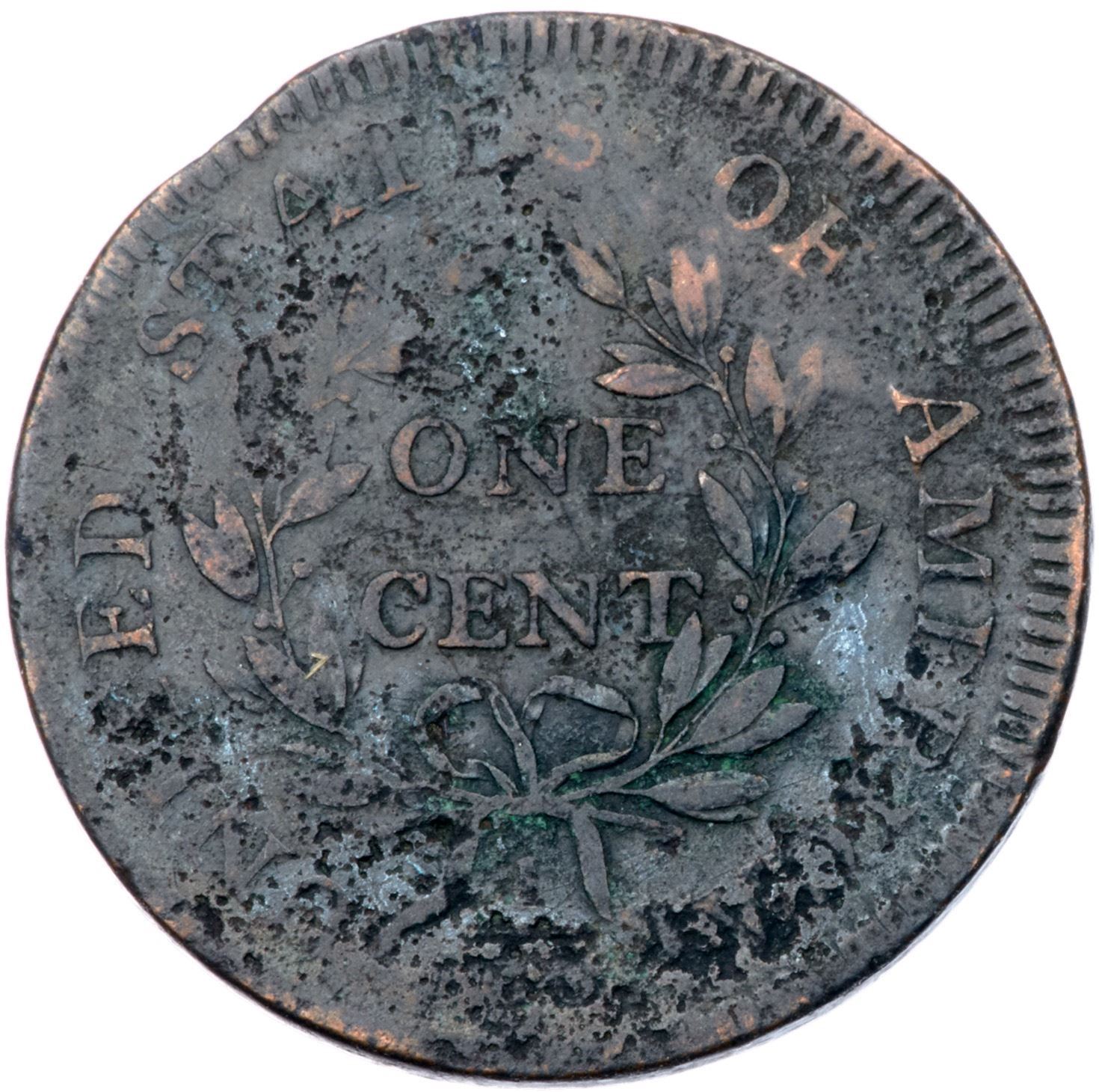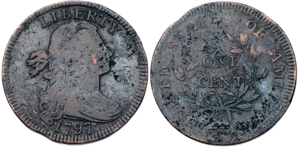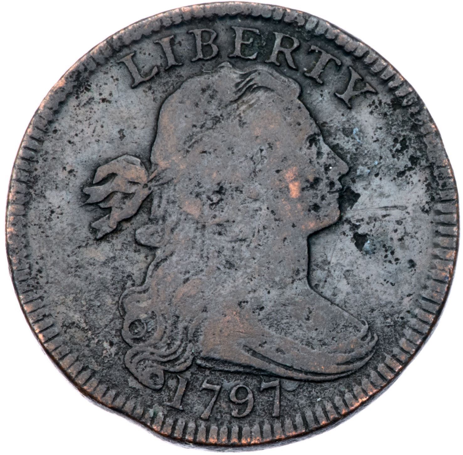 1797 S-138 R-1 G55 points sharper but there is scattered pitting across both sides, and traces of verdigris on the reverse. Mostly glossy dark brown with hints of lighter faded ruddy brown on some high points. Strong date and LIBERTY, readable reverse legends. There is a minor planchet clip left of the date. E-MDS, Breen state III.Certificate Number: