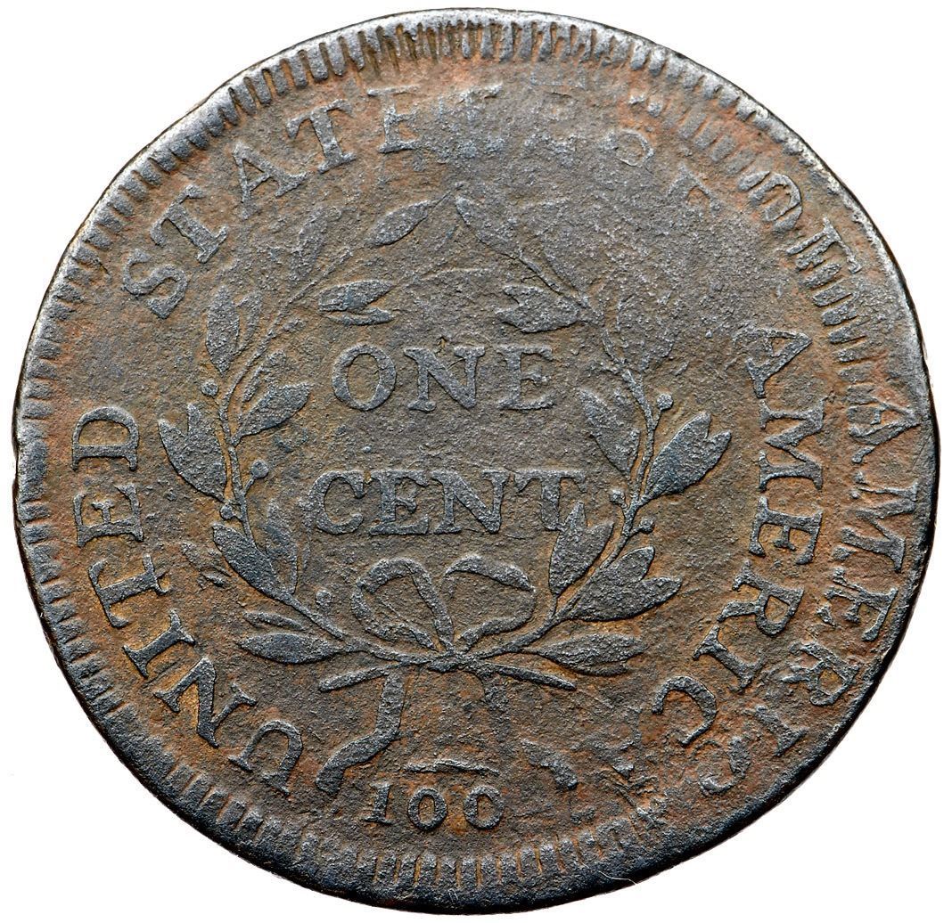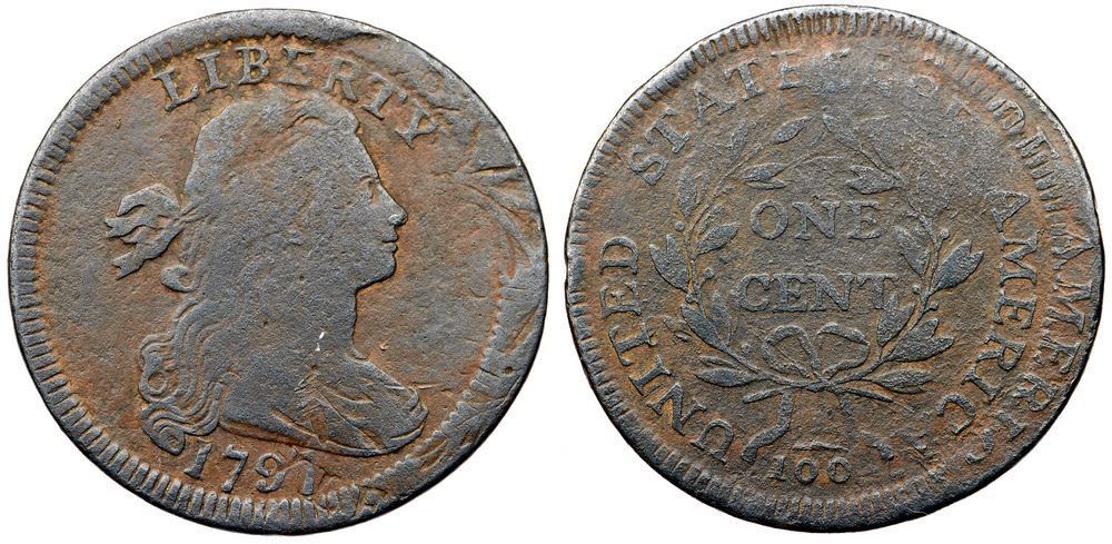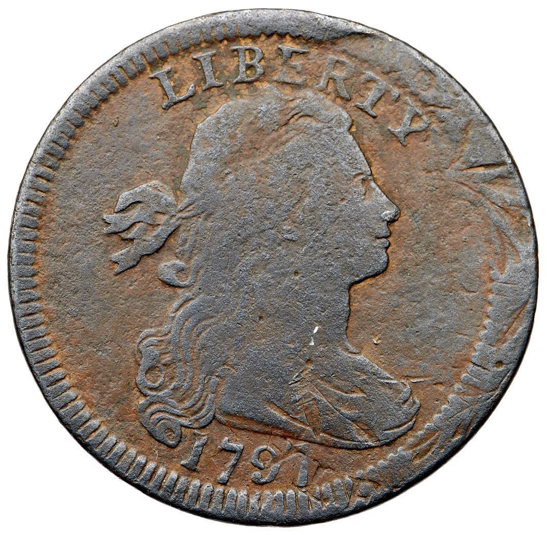 Sharpness F12 but covered with fine to moderate granularity. There are microscopic traces of verdigris in protected areas and just a few contact marks including a nick on the bust and a rim nick at the D in UNITED. Dark steel brown and olive with tan in protected areas. This cent was struck twice. The first impression was an off-center reverse brockage strike and the second was normal and centered on the planchet. Bold evidence of the initial strike is visible on both sides. An incuse ATE shows at the 97 and a normal OF AMERICA shows above the same letters from the second strike. Much more of the initial strike is visible on both sides. A dramatic mint error; just too bad the surfaces are rough.