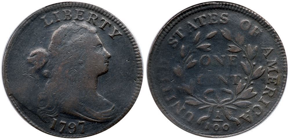 1797 S-139 R-1 ANACS VG8 Details (Corroded, Tooled, Burnished)VG sharpness but the surfaces have been burnished with traces of fine granularity underneath and in the protected areas. There is also evidence of tooling in the form of curved hairlines scratches around the dentils and fields. Mostly deep steel brown with dark brown on some devices and legends. Strong date, full legends. Our grade is G4.Certificate Number: Certificate Number# 7803783
