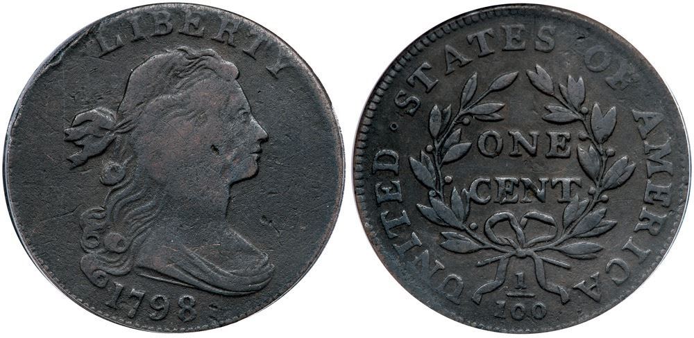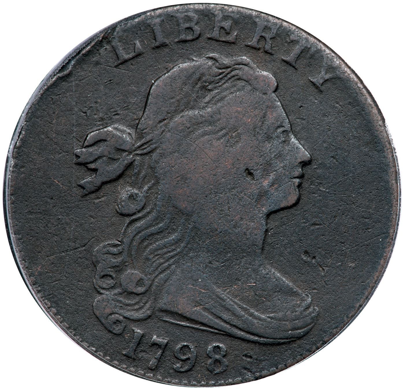 1798 S-172 R-2 ANACS F12 Details (Corroded, Damaged)Fine sharpness but the surfaces are lightly rough with notable damage on Liberty's cheek and the rim left of LIBERTY. There is also a pinprick between UNITED and STATES. Strong date and legends. Our grade is G4.Certificate Number: Certificate Number# 7803785