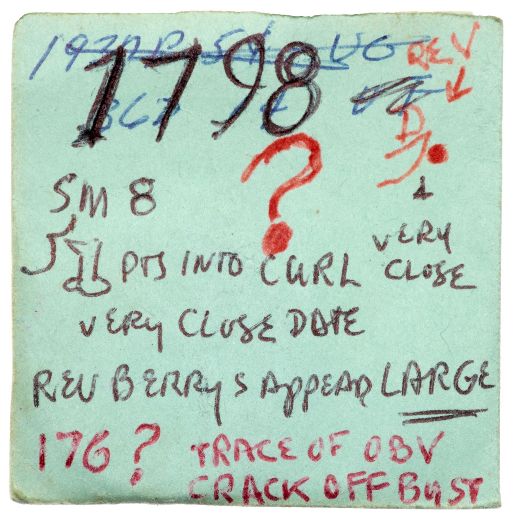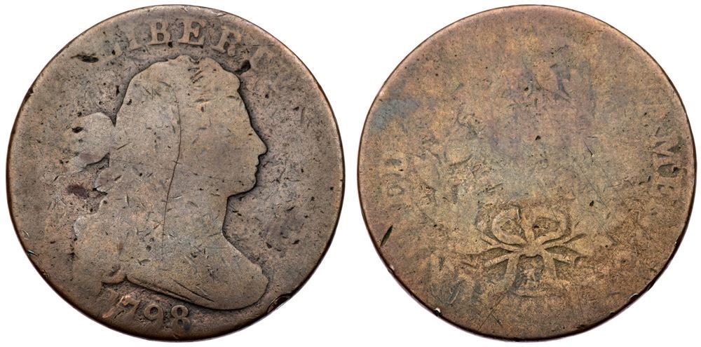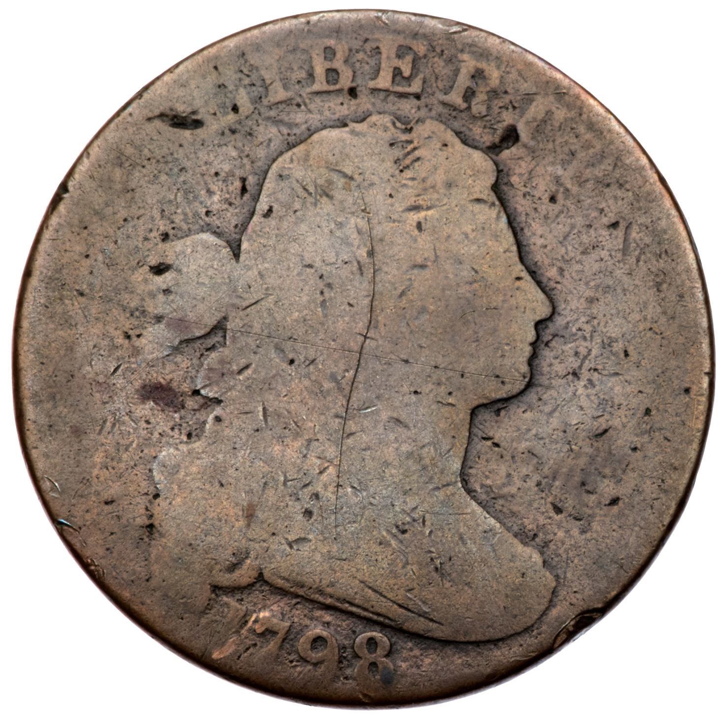 1798 S-176 R-4 FR2+Uniform medium brown obverse, with deeper olive and rose tones on the reverse. There are a couple hairline scratches intersecting on the portrait, trivial nicks otherwise. Smooth, rather glossy surfaces, an overall pleasing example for the grade.Certificate Number: