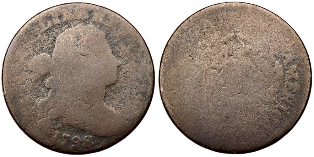 The obverse is better, the reverse weaker. Glossy olive brown and steel. Mostly smooth but there are traces of fine roughness in protected areas. The date is clear and the single leaves at the top of the wreath are weak but visible. A rare variety that is extremely difficult to find in grades above Good.Certificate: Pedigree: Ex Jerry Wysong-Rodney C. Burress-Kevin Vinton-Gary Smith Collection (includes the Burress envelope)