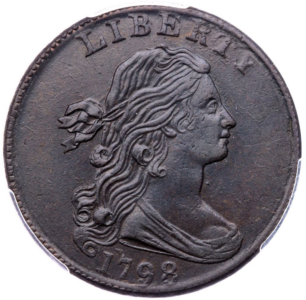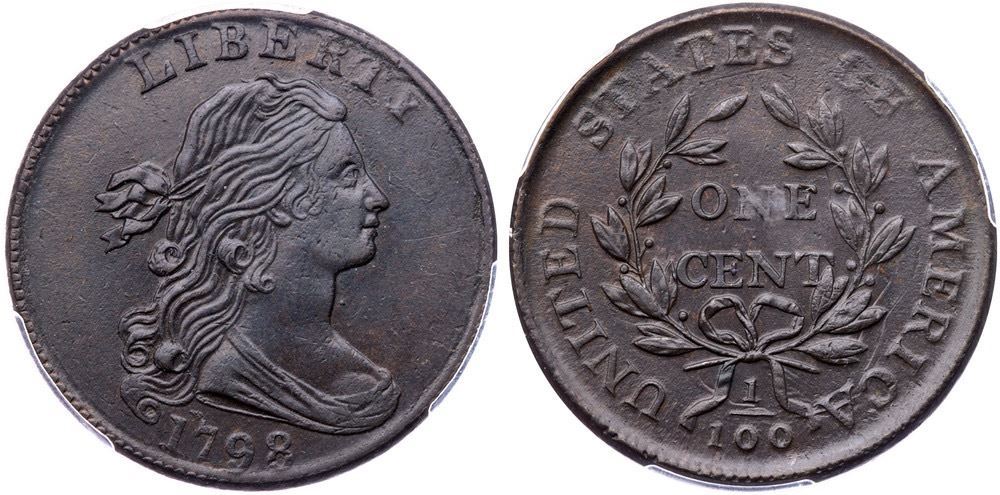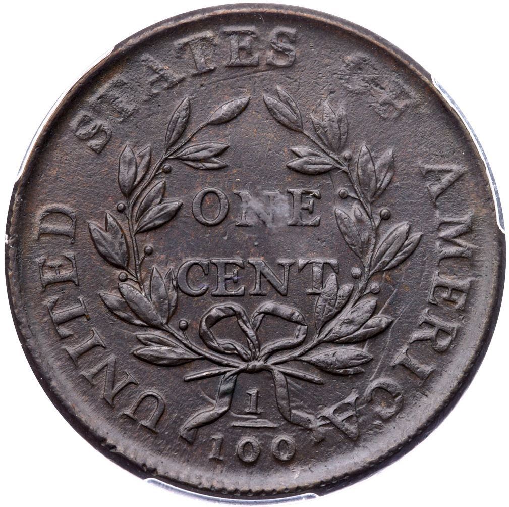 Frosty medium olive brown and steel. The surfaces are lustrous and nearly flawless and this cent has great eye appeal. Look choice mint state but there is a hint of rub on the highest points of the devices. The only notable marks are some tiny pre-striking planchet chips at OF due to a weak strike in that area (opposite the bust tip). M-LDS, Breen state III. There is a fine double profile on the chin and neck. Called AU55 and tied for CC#4 in the Bland census (but graded MS60 by him in 1971). Noyes says AU50 and tied for CC#3, his photo #24083. Our grade is AU55. The attribution and Ralls provenance are shown on the PCGS label. (The reverse of the slab is badly scuffed.)