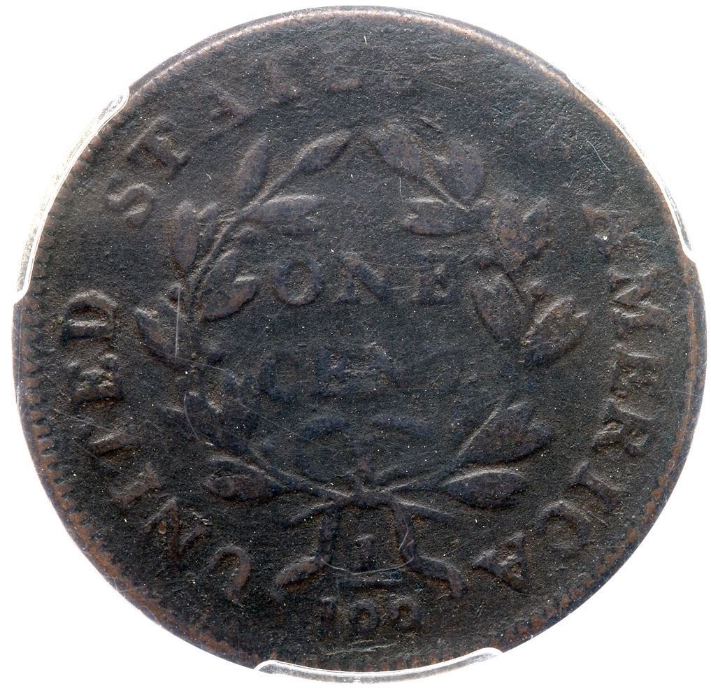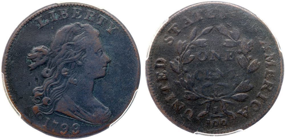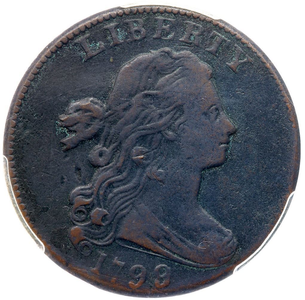Slightly glossy very dark olive brown and steel with slightly lighter toning on the highpoints. The fields and protected areas are covered with fine roughness and there are traces of verdigris in some protected areas. The obverse details are significantly sharper than those on the reverse, perhaps a 15/7 split. Just a few marks including a dull, old scratch through the bottom of the date and a pair of small nicks in the field under the hair ribbon. The date and LIBERTY are complete and relatively strong. The legends on the reverse are clear except for weakness at ES-OF. EDS. Our grade is net VG8. Not perfect but the strong date is a big plus. The overdate is noted on the PCGS label. 1446.97/28731897 Ex the Del Rio Collection