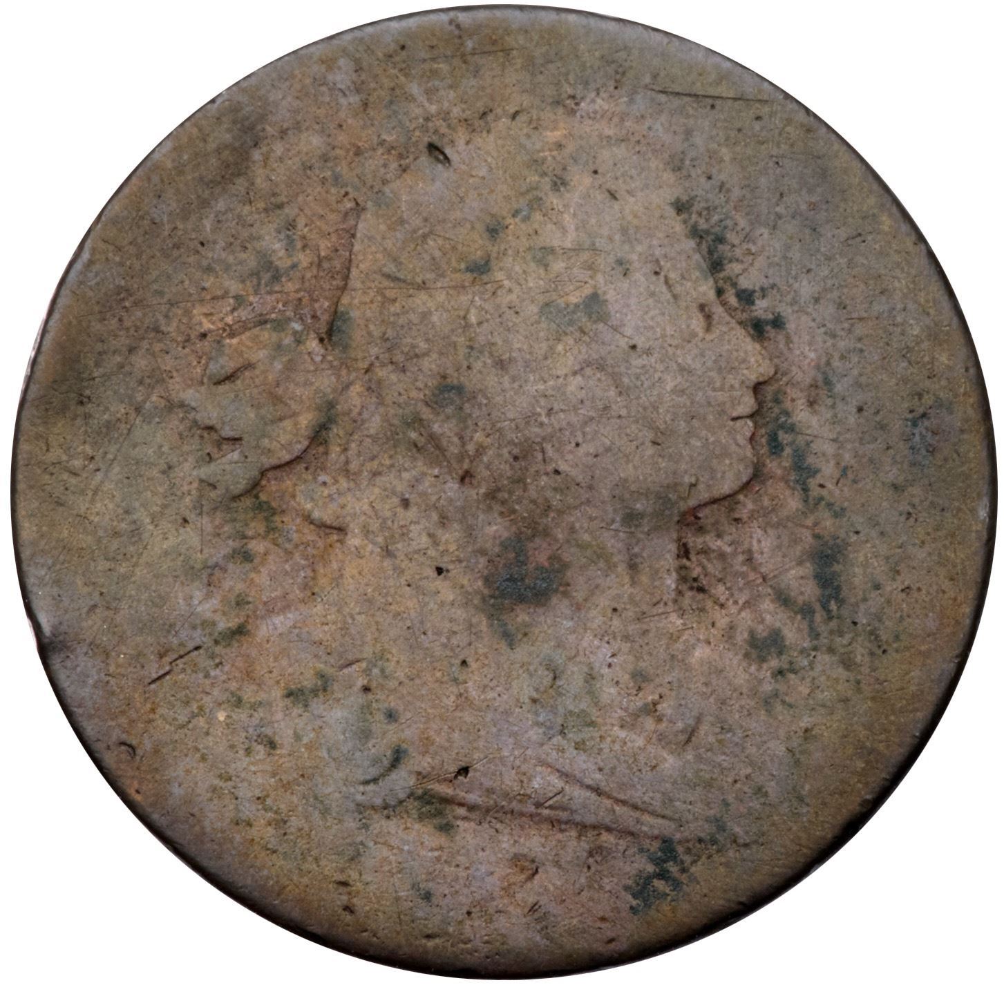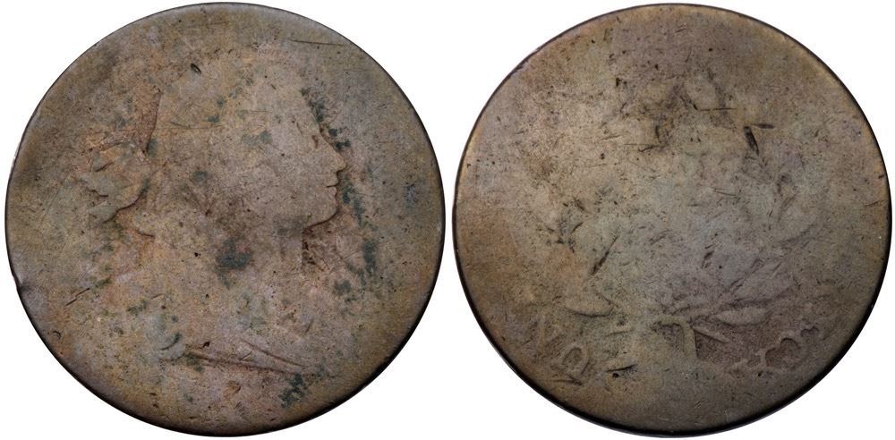 1800/798 S-191 R-3 P1Cleaned long ago and now a mixed olive brown with rose and maroon tones. There are wispy hairline scratches on the obverse, and a rim nick at K-8.5. Fairly smooth surfaces. LDS with the large rim break on the bottom reverse.Certificate Number: