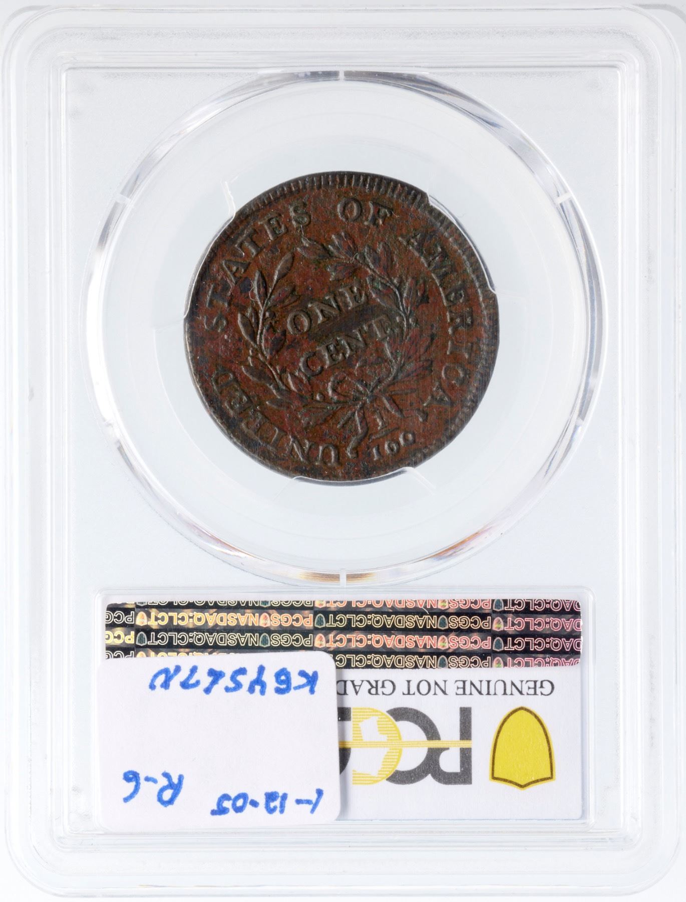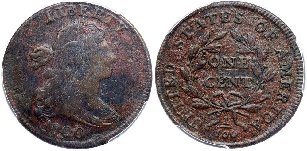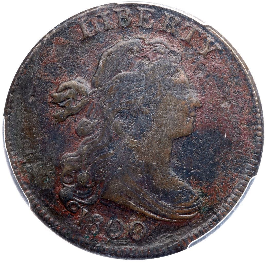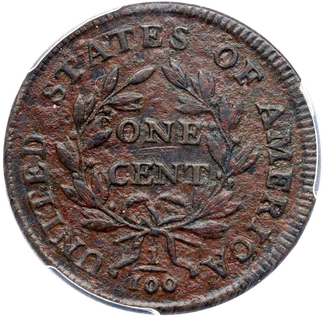 Glossy but ugly with a blotchy mix of olive brown, lighter brown, and reddish brown toning on moderately rough surfaces. The only contact marks is a short horizontal scratch under the N in ONE. Great details, especially on the reverse. The date and legends are strong and spike up from the top of the I in AMERICA is bold. Our grade is F15 sharpness net VG7. One of the sharpest known of this tough variety, and it comes with a nice provenance.. 1449.97/37228766 Ex Donald Ballou-C. Douglas Smith 1/27/1956-Dorothy I. Paschal 11/1977-Dr. Thomas S. Chalkley, Superior 1/28/1990:412-Wesley A. Rasmussen, Heritage Auctions 1/13/2005:3236-Colonel Steven K. Ellsworth Collection (includes the Rasmussen and Ellsworth collection envelopes and both lot tickets)