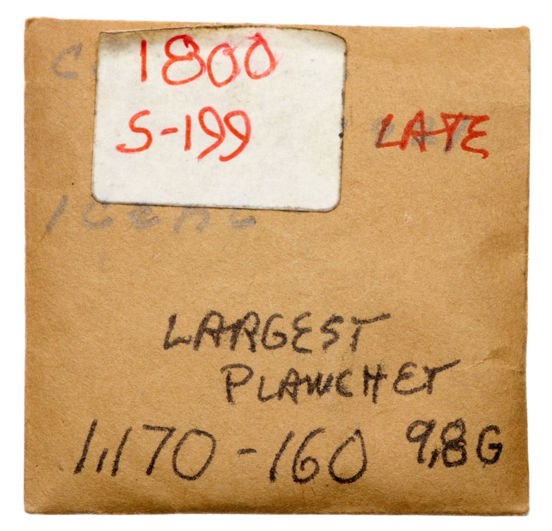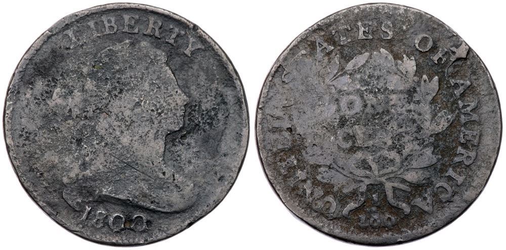 1800 S-199 R-4 AG3G6 sharpness but the surfaces are corroded with dents on the rims and one before the mouth. Dark brown and steel. Strong date. M-LDS.Certificate Number: