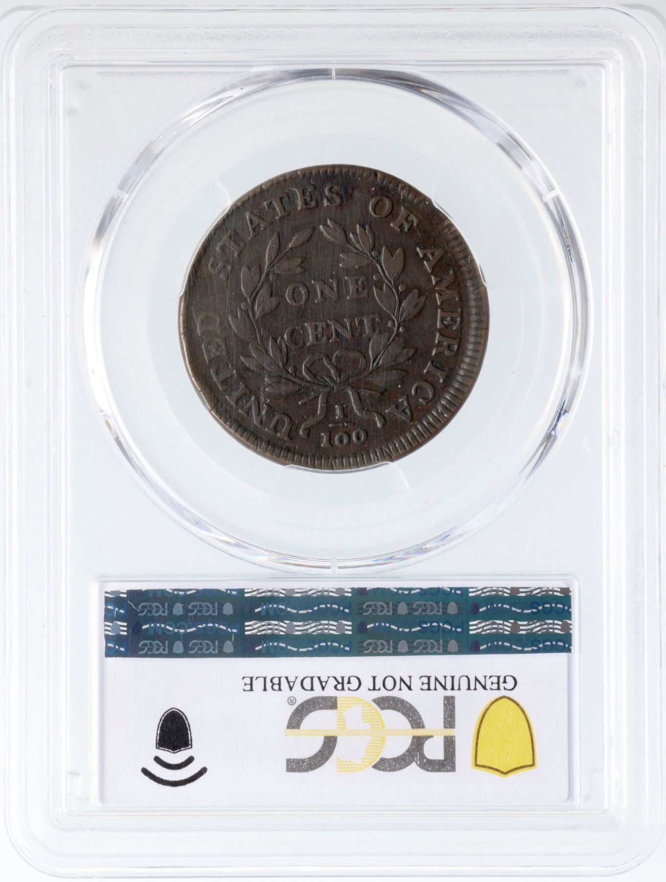 Rather glossy olive brown and steel with lighter brown in the field behind the portrait. There is fine verdigris and minor roughness visible under magnification but the eye appeal of this cent is nice for the grade. A rim bruise at the T in UNITED and some faint vertical scratches at the back of the head are the only notable marks. EDS, Breen state I. Our grade is net F12. 1449.97/48205336 Ex Douglas F. Bird 1/2004-Mike Swift 1/6/2017 (includes the Bird sales ticket and Swift collection envelope)