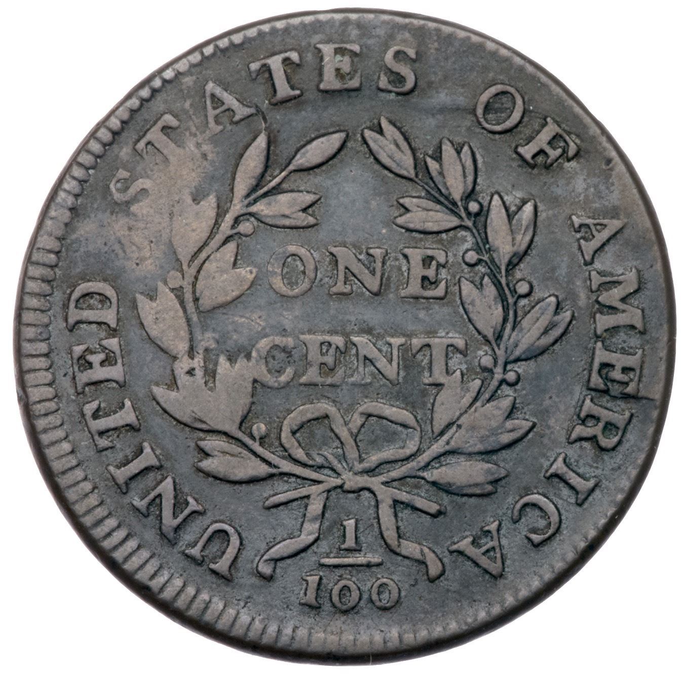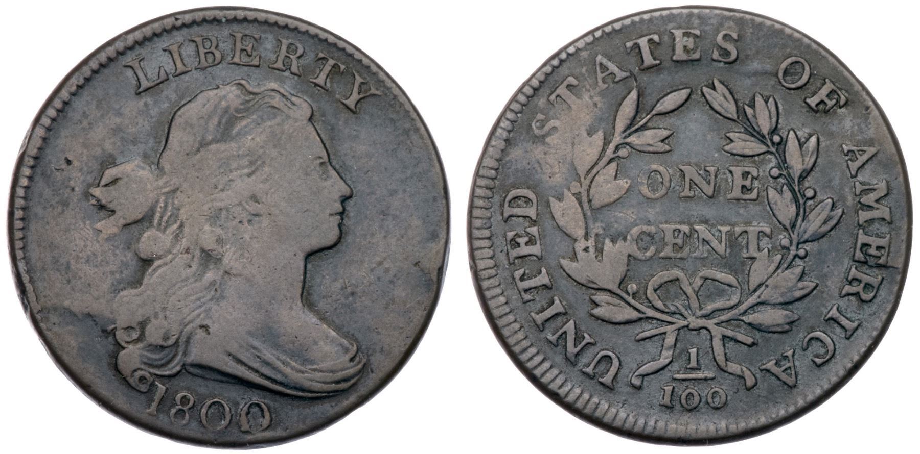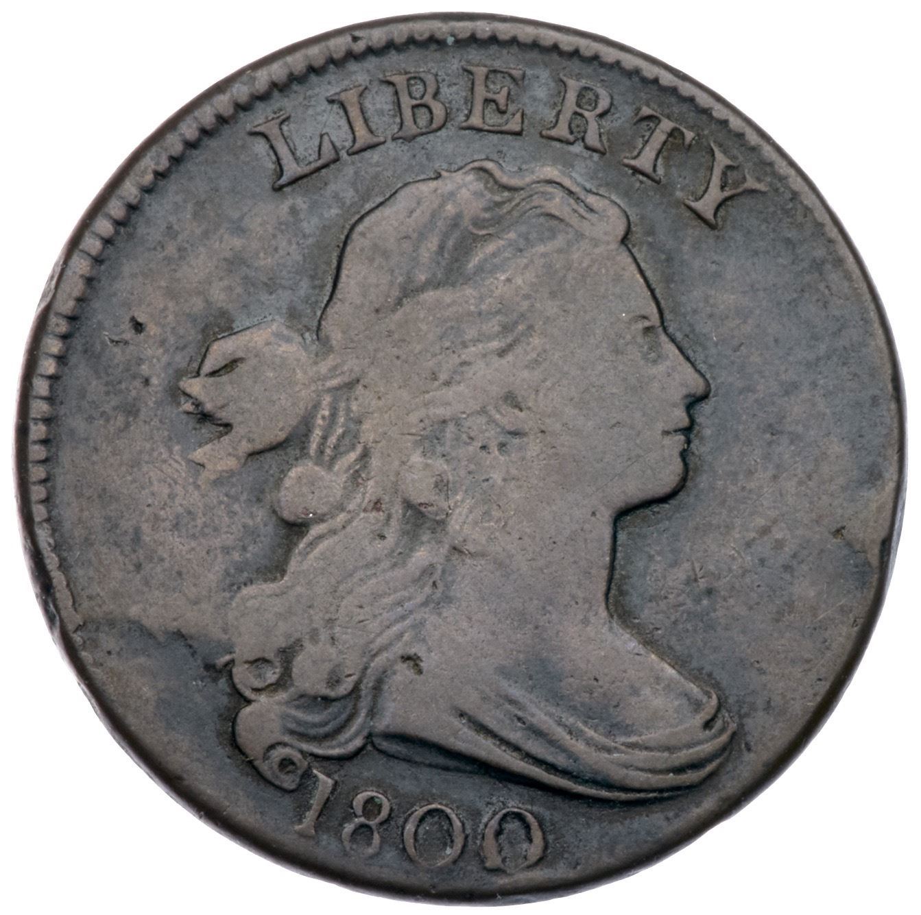 1800 S-201 R4+ VG10+Sharpness a bit better but there is a rim bruise off the chin and a pair of barely visible rim bruises behind the portrait. Smooth with glossy steel brown toning on the devices and darker olive brown and steel in protected areas. The reverse is quite nice for the grade. LDS, Breen state V late, with significant swelling in several places on the reverse. The die failure at the lower curls is strong. Graded F15 net VG8 and tied for CC#6 in the Noyes census, his photo #25915.Certificate Number: Pedigree: Ex Darwin B. Palmer, Jr.-Fred H. Borcherdt Collection