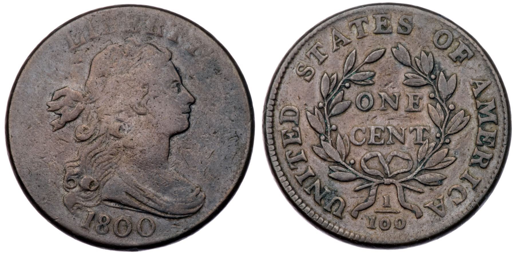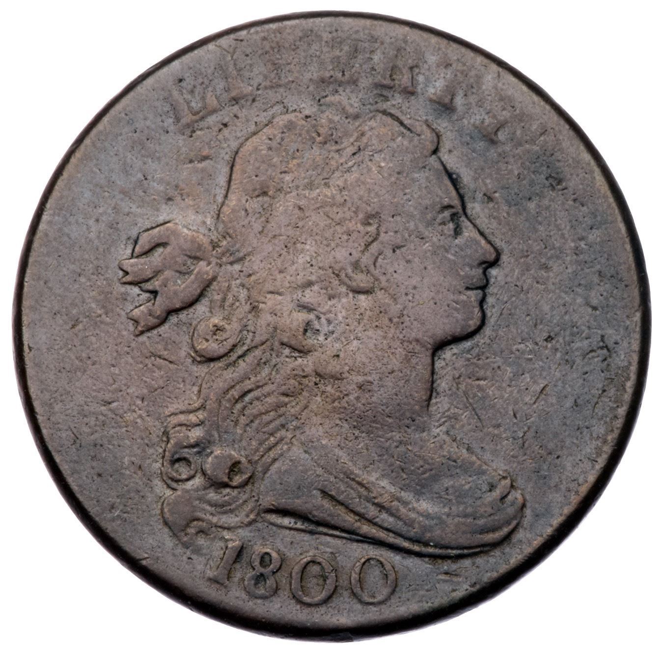 1800 S-204 R4 F12A few points sharper with tiny nicks scattered over the obverse, none significant but too many to ignore. Mostly glossy medium chocolate brown and steel with specks of darker olive brown on the right side of the obverse. MDS with minor swelling right of TY. The date is strong.Certificate Number: Pedigree: From the Fred H. Borcherdt Collection