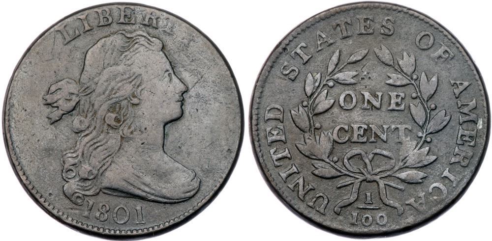 1801 S-213 R-2 F155 points sharper but there is faint microscopic roughness on both sides. There are a few faint pin scratches, one before the nose, on between 18 and 01, an one left of 1. Otherwise glossy dark brown surfaces. MDS, Breen state IV.Certificate Number: