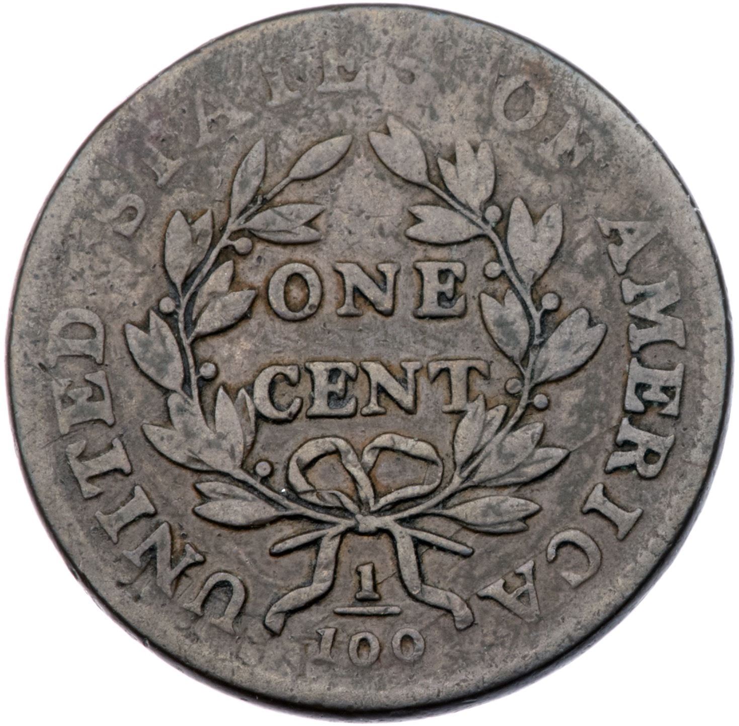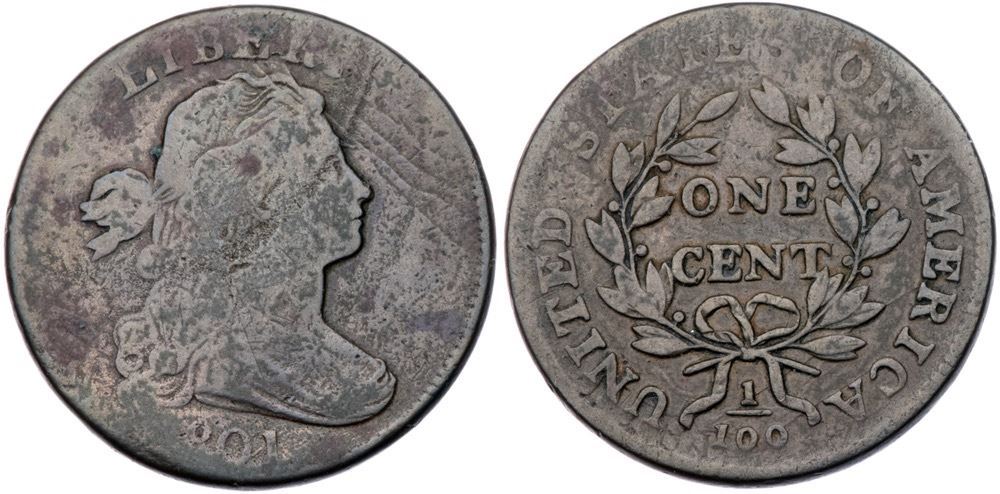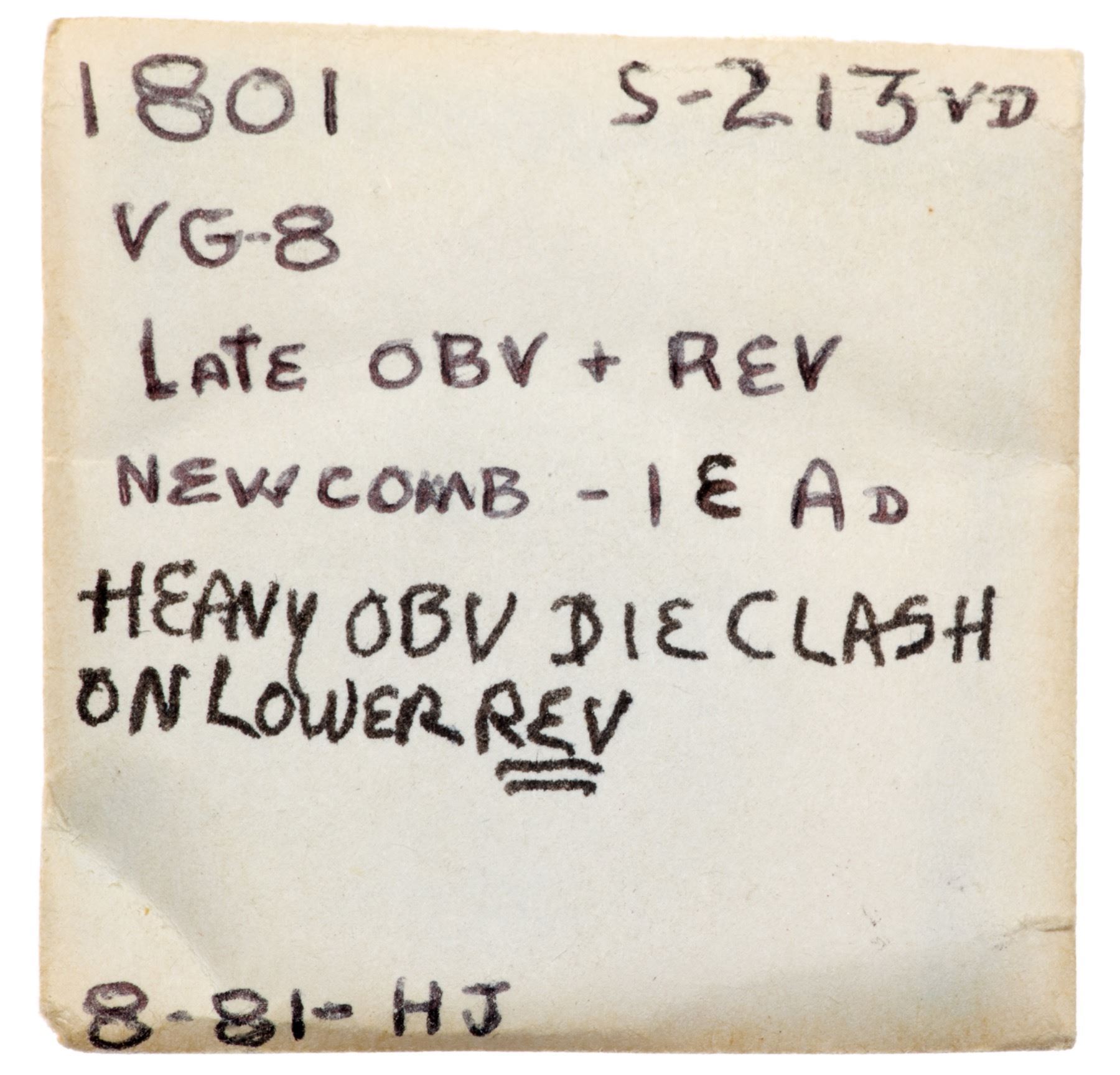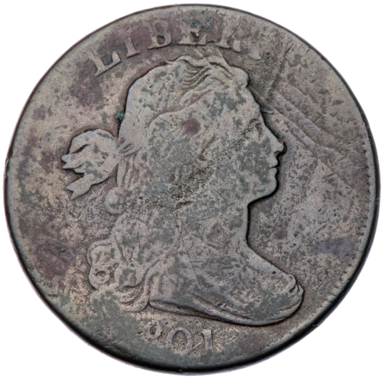 1801 S-213 R-2 VG7Slightly sharper but there are scattered spots of minor roughness and verdigris. Olive gray and steel with maroon spots. TDS, Breen state IX. Certificate Number: