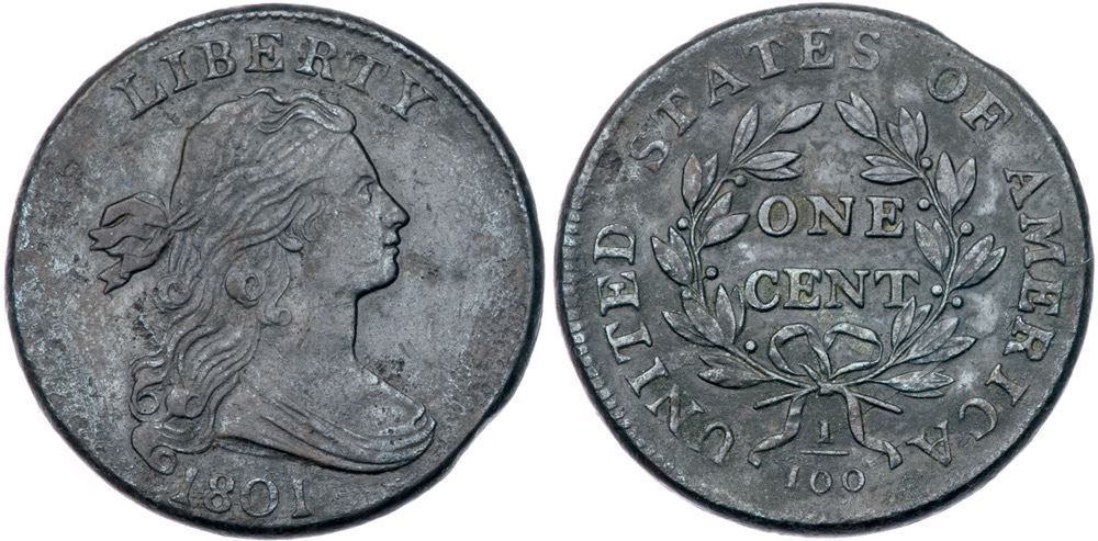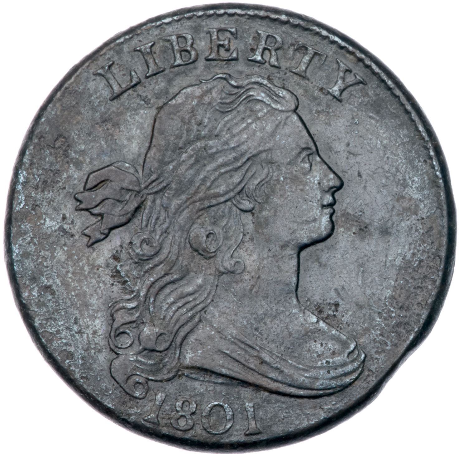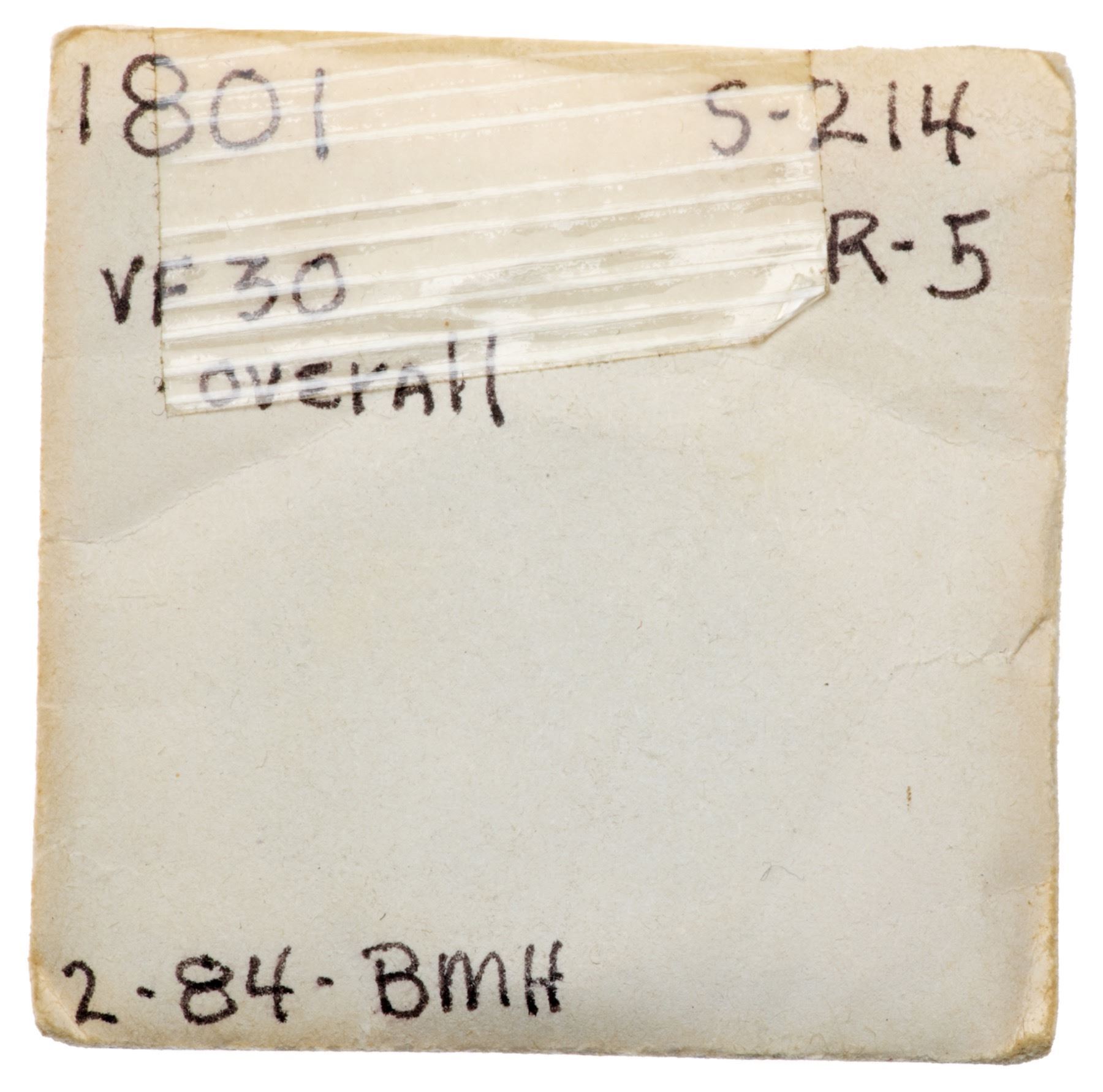 1801 S-214 R-4+ F15XF40+ sharpness but the surfaces are corroded with a mixed ebony, olive, and dark brown patina. Free of notable marks, though there is a minor planchet clip just right of the bust tip. EDS, Breen state I.Certificate Number: