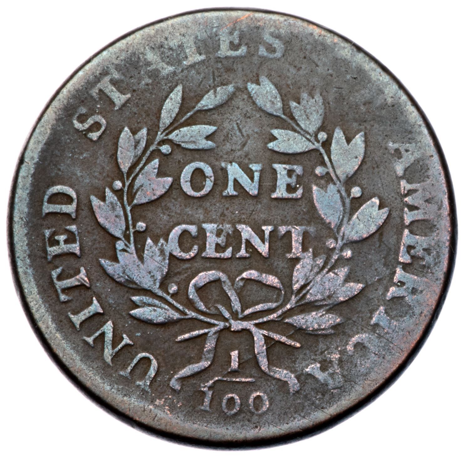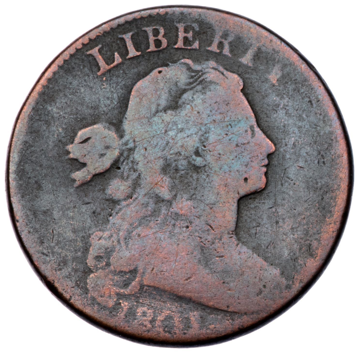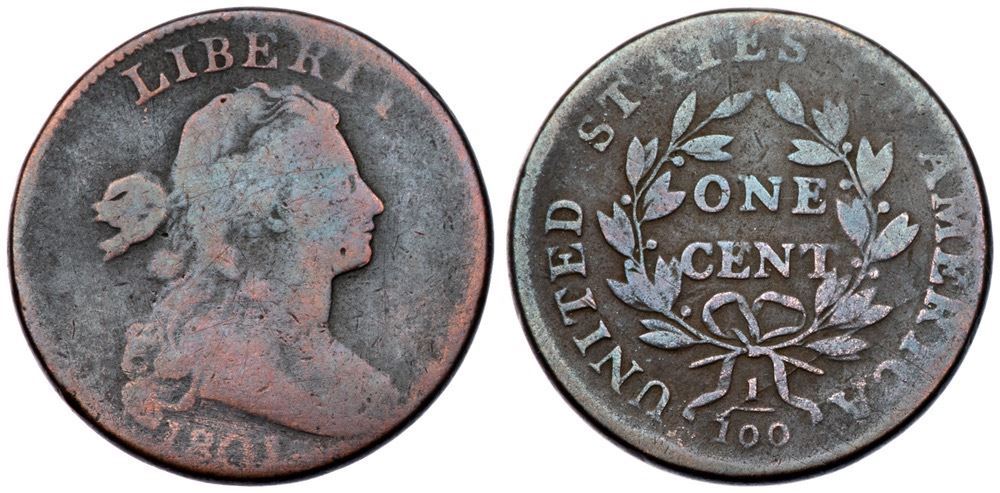 1801 S-214 R-4+ G4Slightly sharper but microscopic roughness covers the surfaces, minimized by an old cleaning that left faint hairlines on the surfaces. Now toned deep bluish steel with faded ruddy brown on some of the devices and high points. Weak at OF but readable legends and date. LDS.Certificate Number: