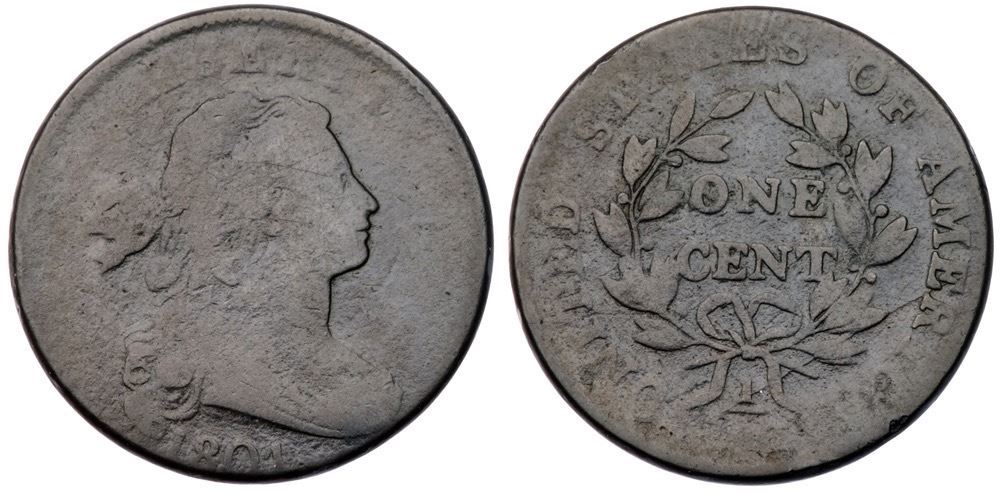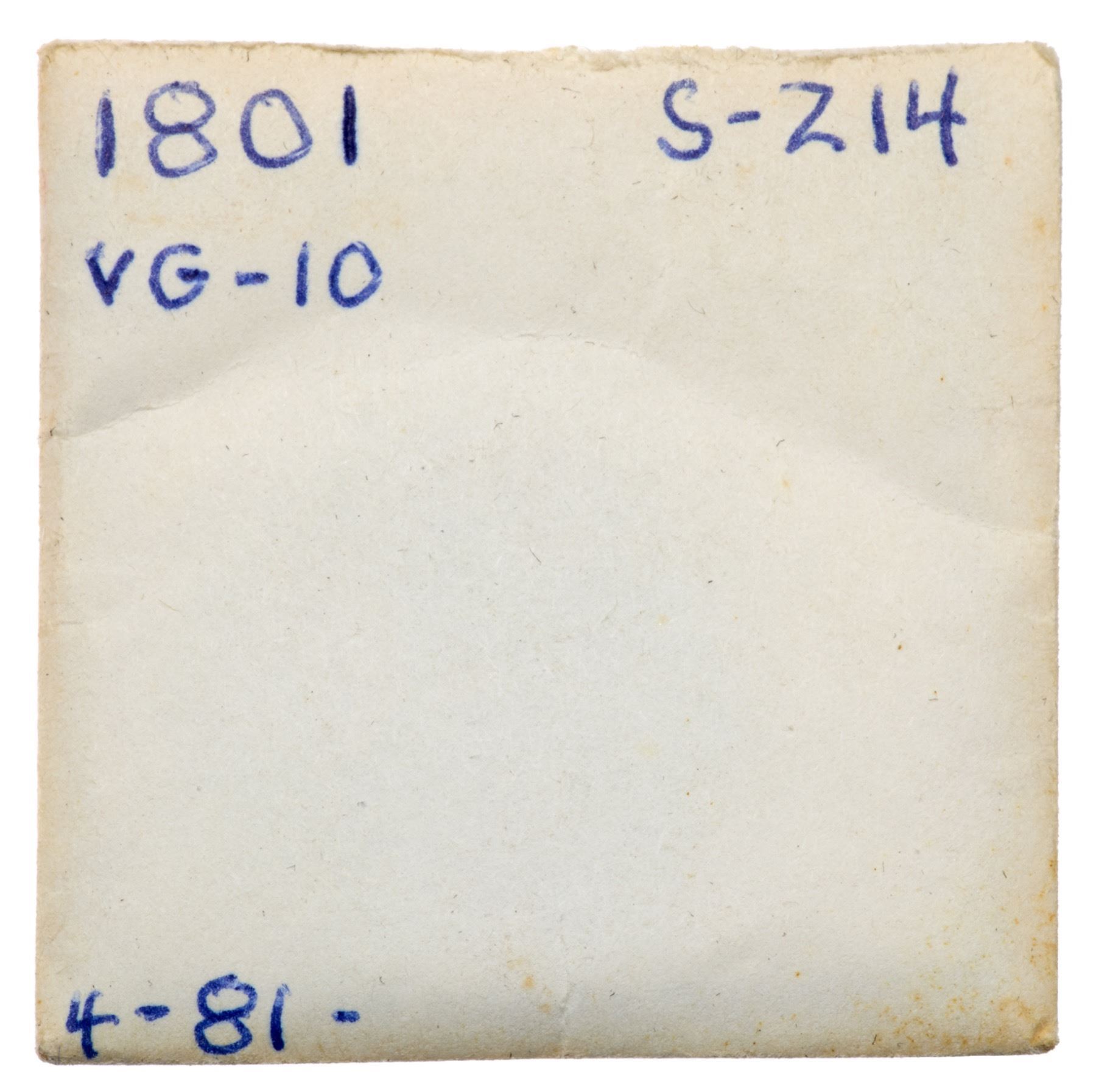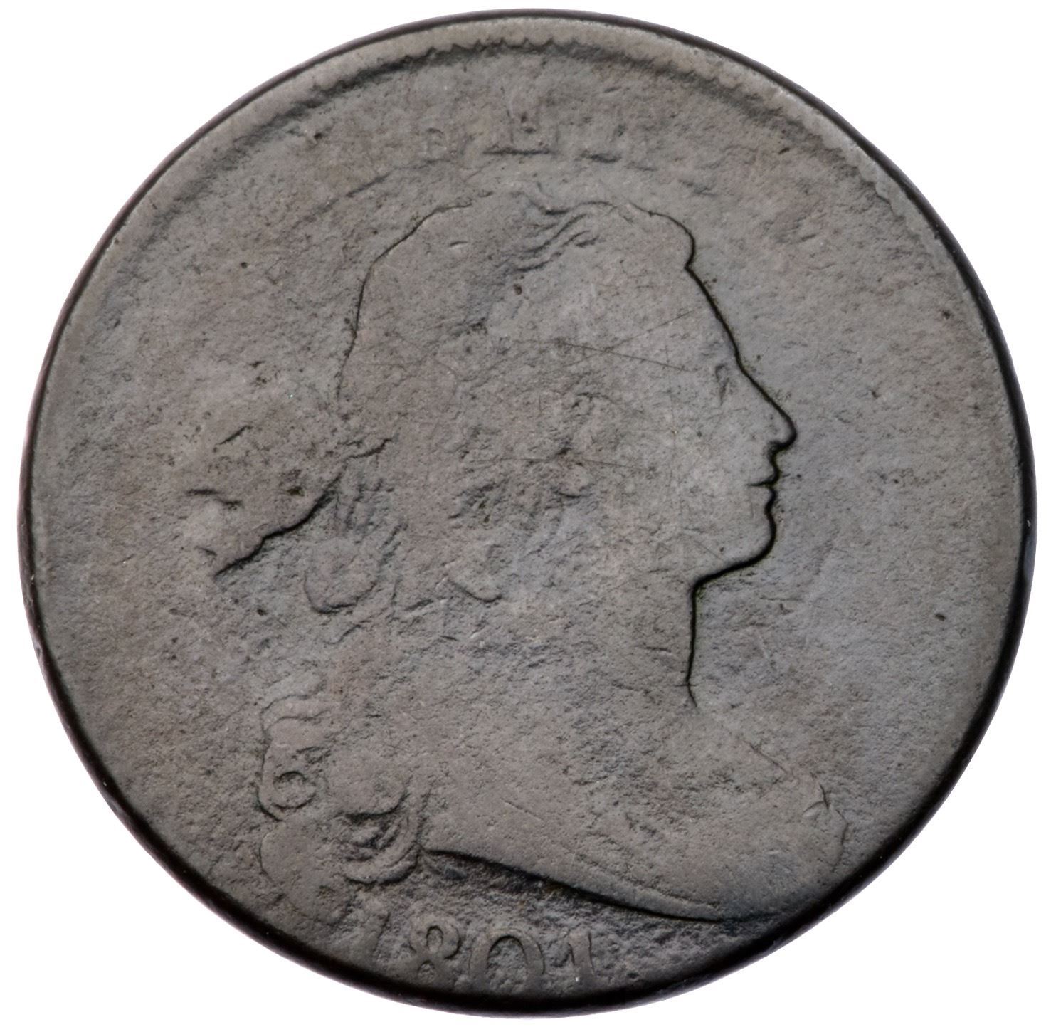 1801 S-214 R-4+ G6Glossy dark olive brown, a few shades lighter on the devices. There are a couple wispy pin scratches that blend in well on the portrait, and a rim nick over CA in AMERICA, no other notable marks. Struck slightly off center towards K-6 on the obverse, resulting in the bottom of the digits not making the planchet but the date remains readable. MDS.Certificate Number: