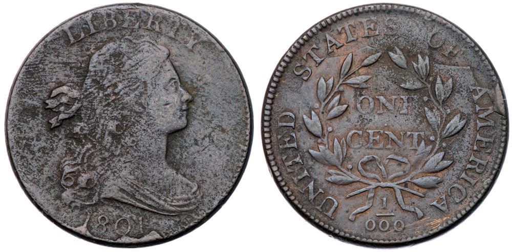 1801 S-220 R-3 1/000 VG10VF30 sharpness fine to moderate corrosion on the surfaces. Mostly dark livei with ruddy brown underneath in the reverse protected areas. LDS, Breen state VII.Certificate Number: