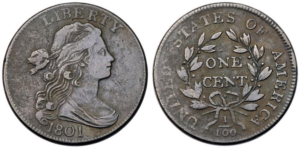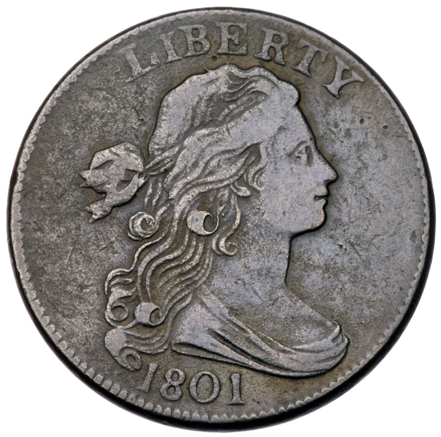 1801 S-221 R-2 Corrected Fraction F12VF sharpness but fine granularity covers most of the surfaces except the devices, which are smooth. Trivial marks in the fields, nothing noteworthy. Glossy dark brown and dark olive surfaces. M-LDS, Breen state IV.Certificate Number: