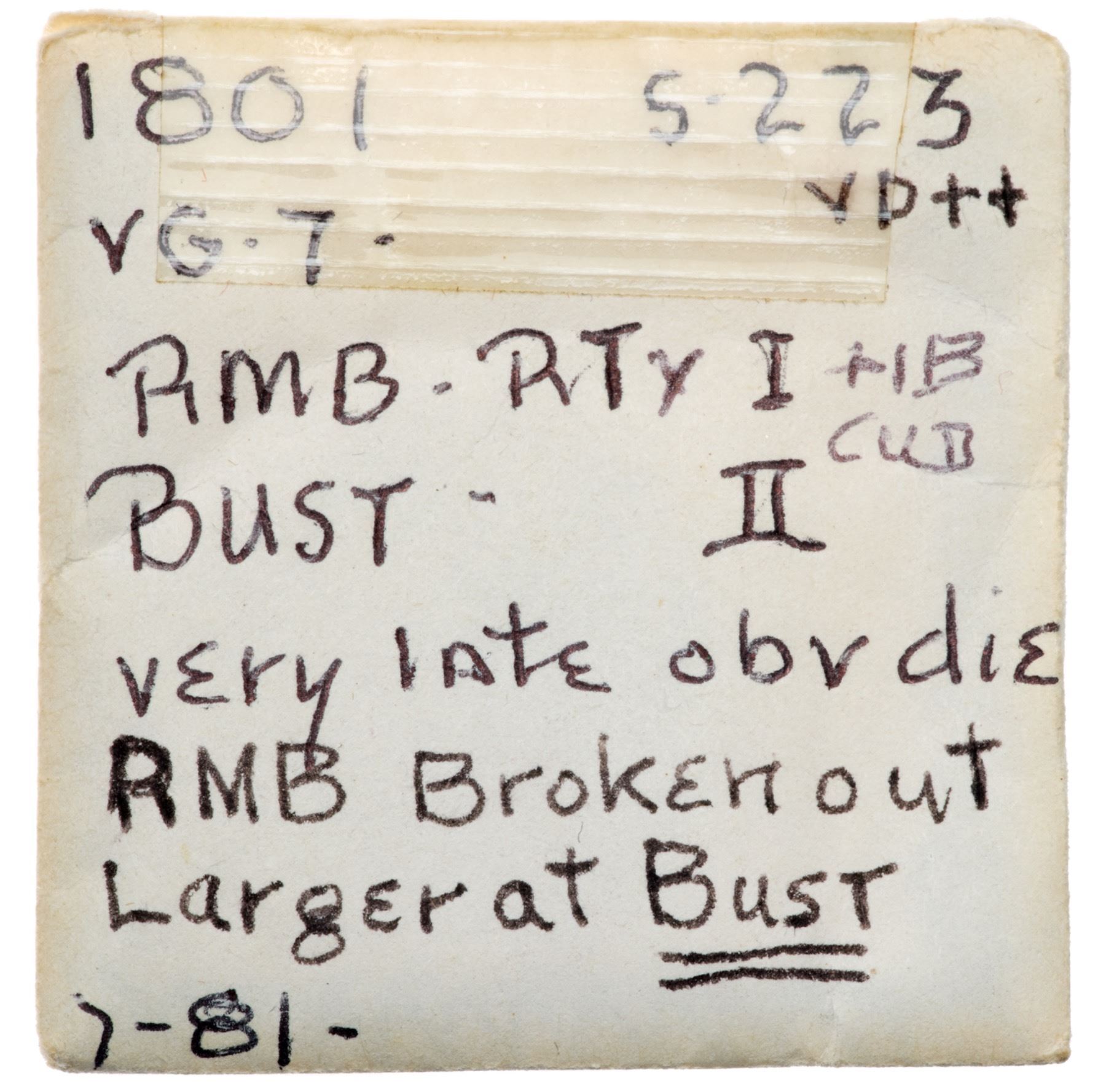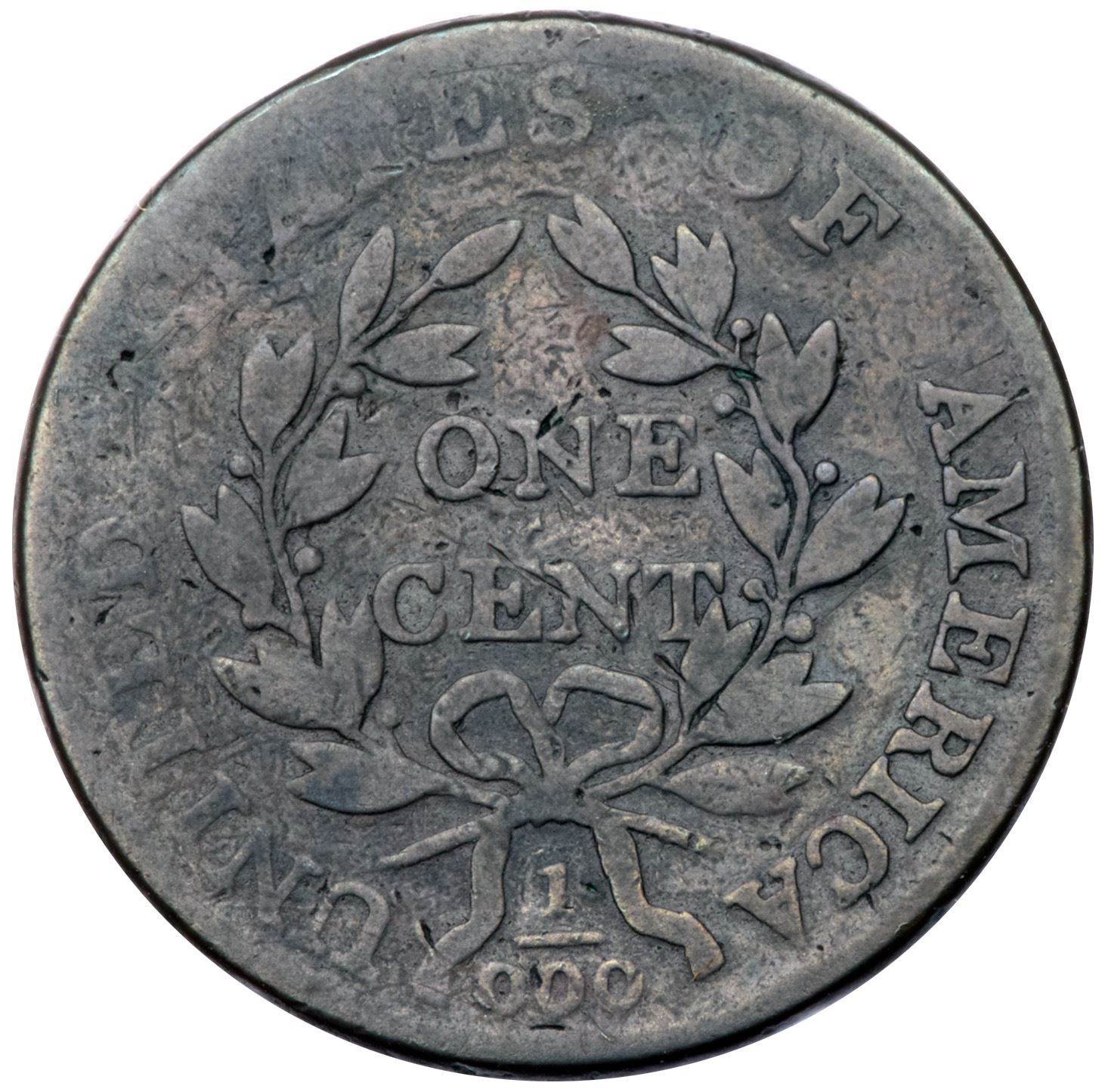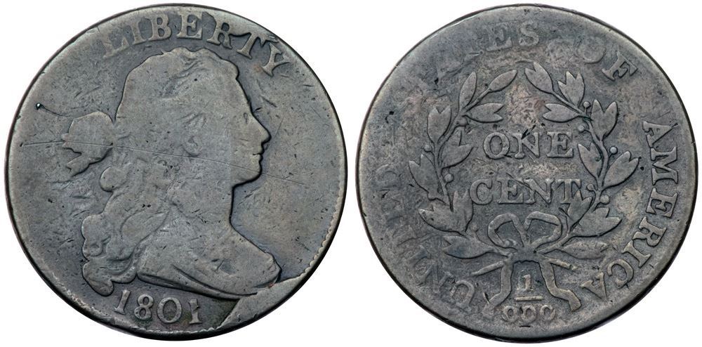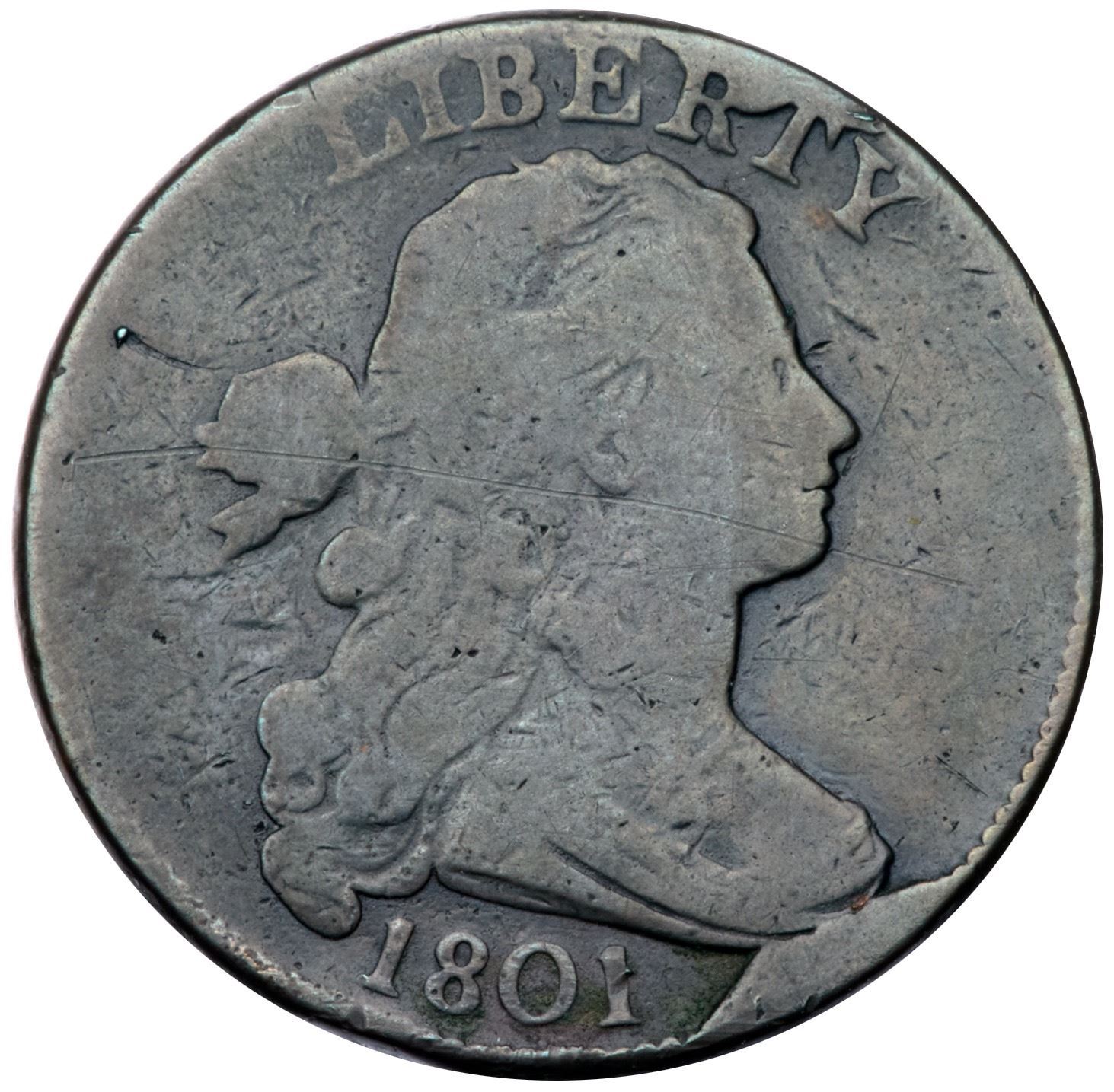 1801 S-223 R-1 1/000 G6Slightly sharper but cleaned long ago and now olive gray surfaces with an old scratch across the obverse with a smaller one behind the hair braid and minor nicks on the central reverse. Strong date, full legends. TDS, Breen state VI with the large rim cud under the bust tip. Certificate Number: