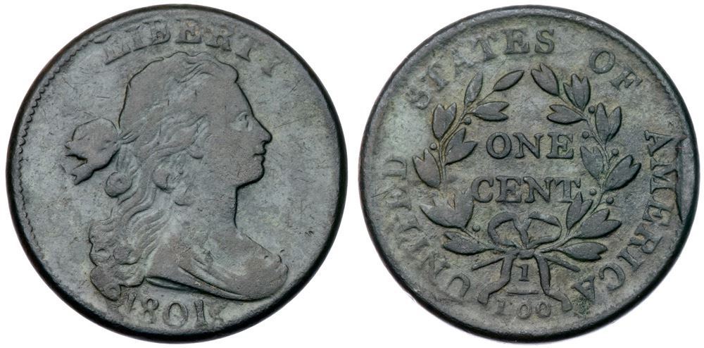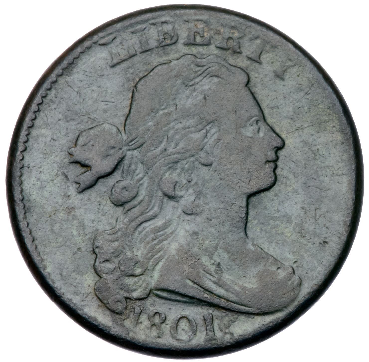 1801 S-224 R-1 VG10VF20 sharpness but the surfaces are granular with verdigris on both sides giving a jade green and steel patina. There are trivial marks on the fields and devices, nothing noteworthy. MDS, Breen state II with the large rim cud over AME.Certificate Number: