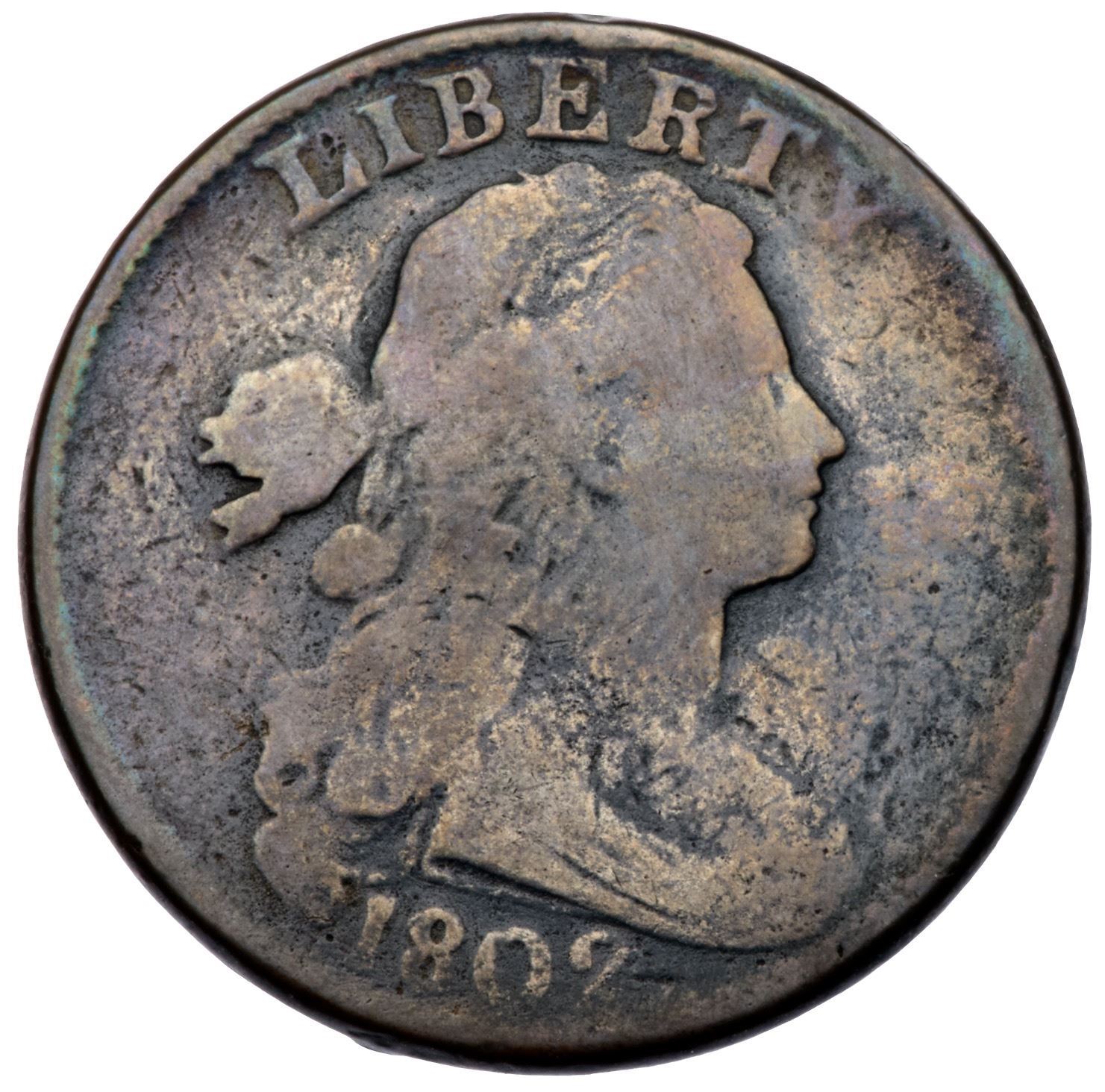 1802 S-231 R-1 G6VG7 but the surfaces are slightly rough. The only marks are a minor rim bruise at K-3.5 and rim nick over E in STATES. Two tone light steel and dark steel surfaces. Weak at OF but otherwise full date and legends.Certificate Number: