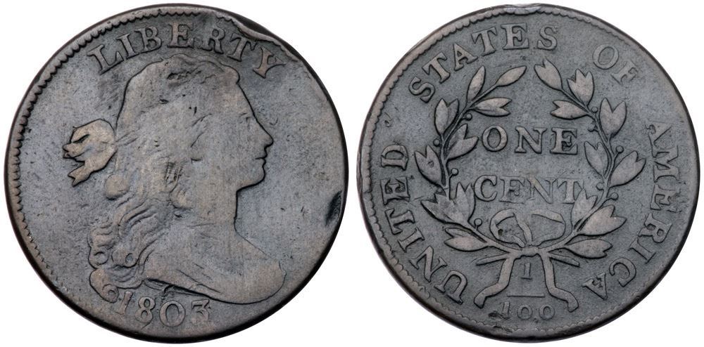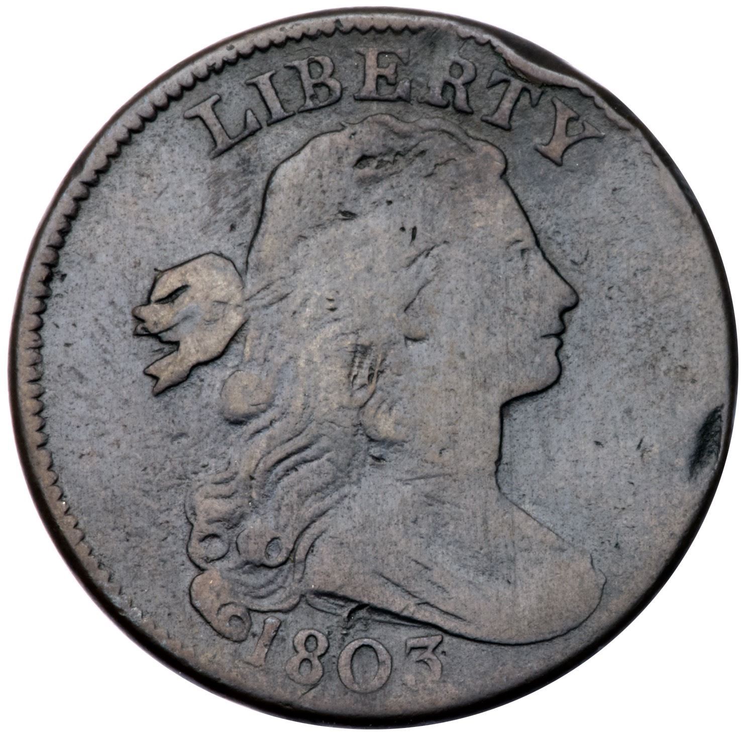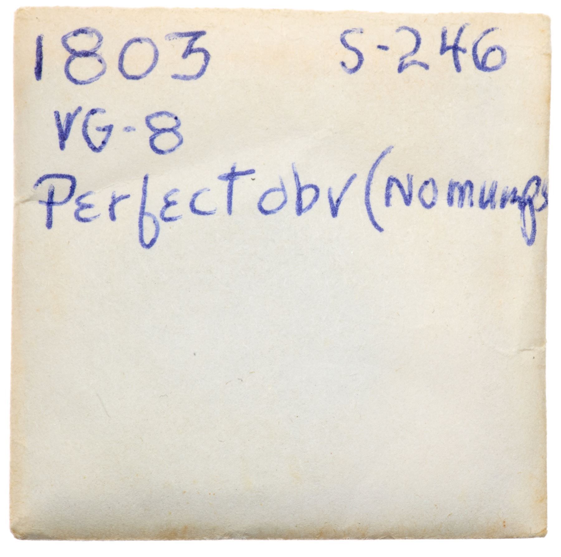 1802 S-246 R-3 VG7VG10+ but there is damage over ERT in LIBERTY and at K-3 on the obverse. There are also minor rim bumps at ED in UNITED, ES in STATES, and under the fraction. Glossy medium to dark brown surfaces with hints of deeper olive on the reverse. EDS, Breen state I.Certificate Number: