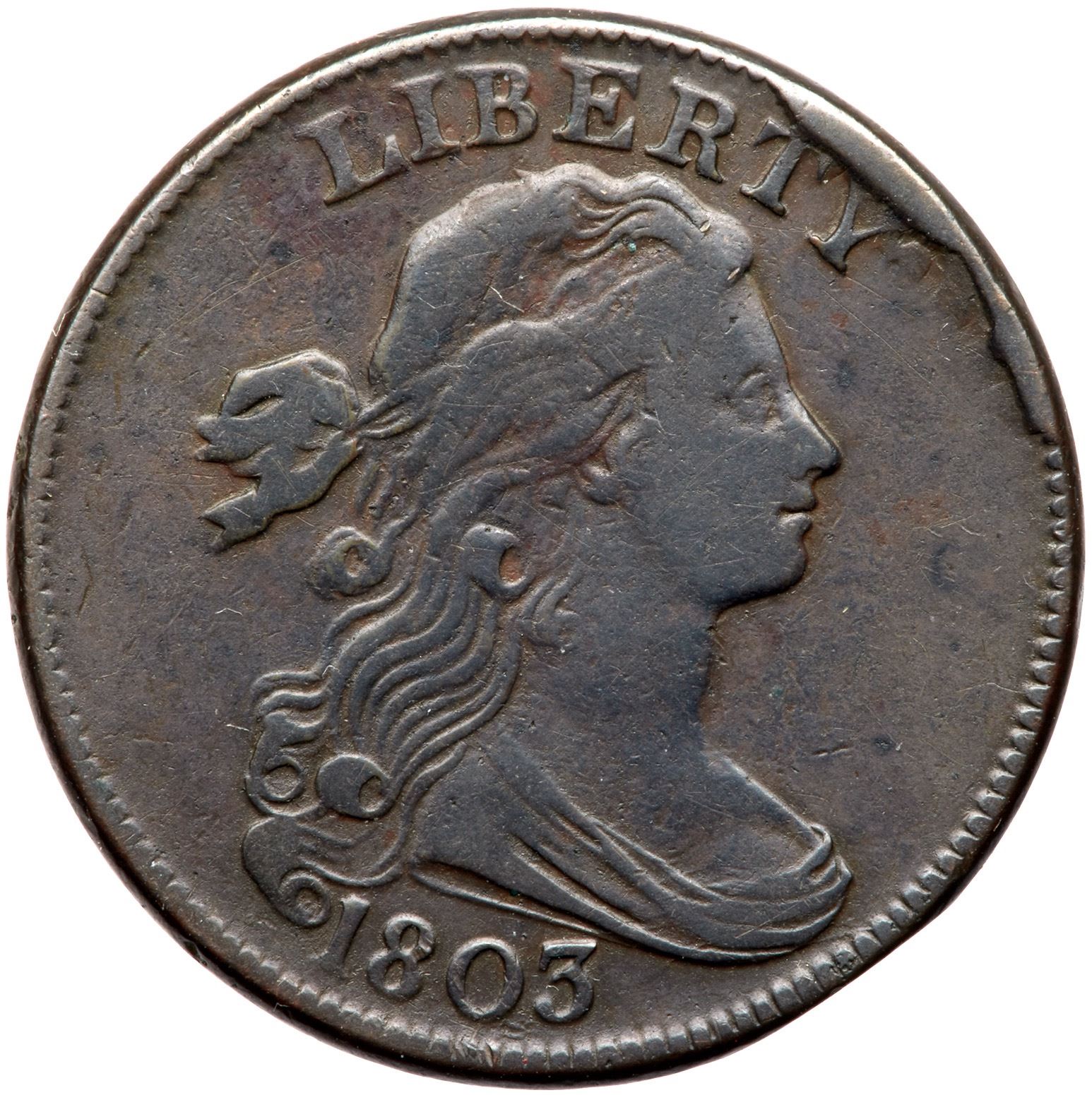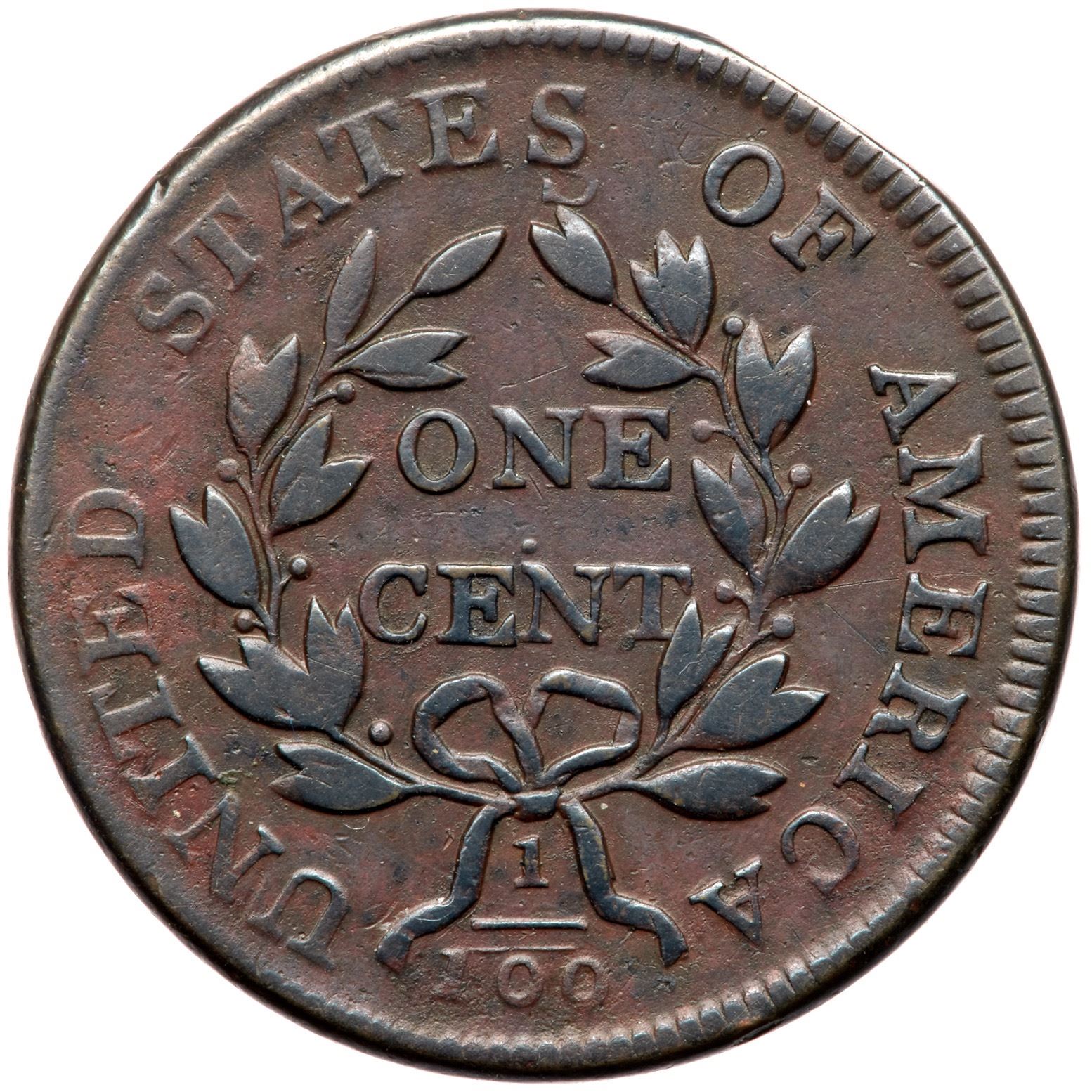 Slightly sharper but a bit dull from extremely faint roughness in the fields and protected areas. No verdigris and the only notable mark is a tiny rim nick at the second A in AMERICA. Slightly glossy dark steel and olive brown with lighter steel brown toning in protected areas, particularly on the reverse. Terminal die state, Breen V, with strong rim cuds over TY extending to the rim before the face. A minor planchet clip barely affects the dentils at the bust tip. The date and legends are strong. The Stemless Wreath, Doubled Fraction Bar, and Doubled Second S in STATES features are obvious.