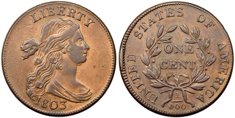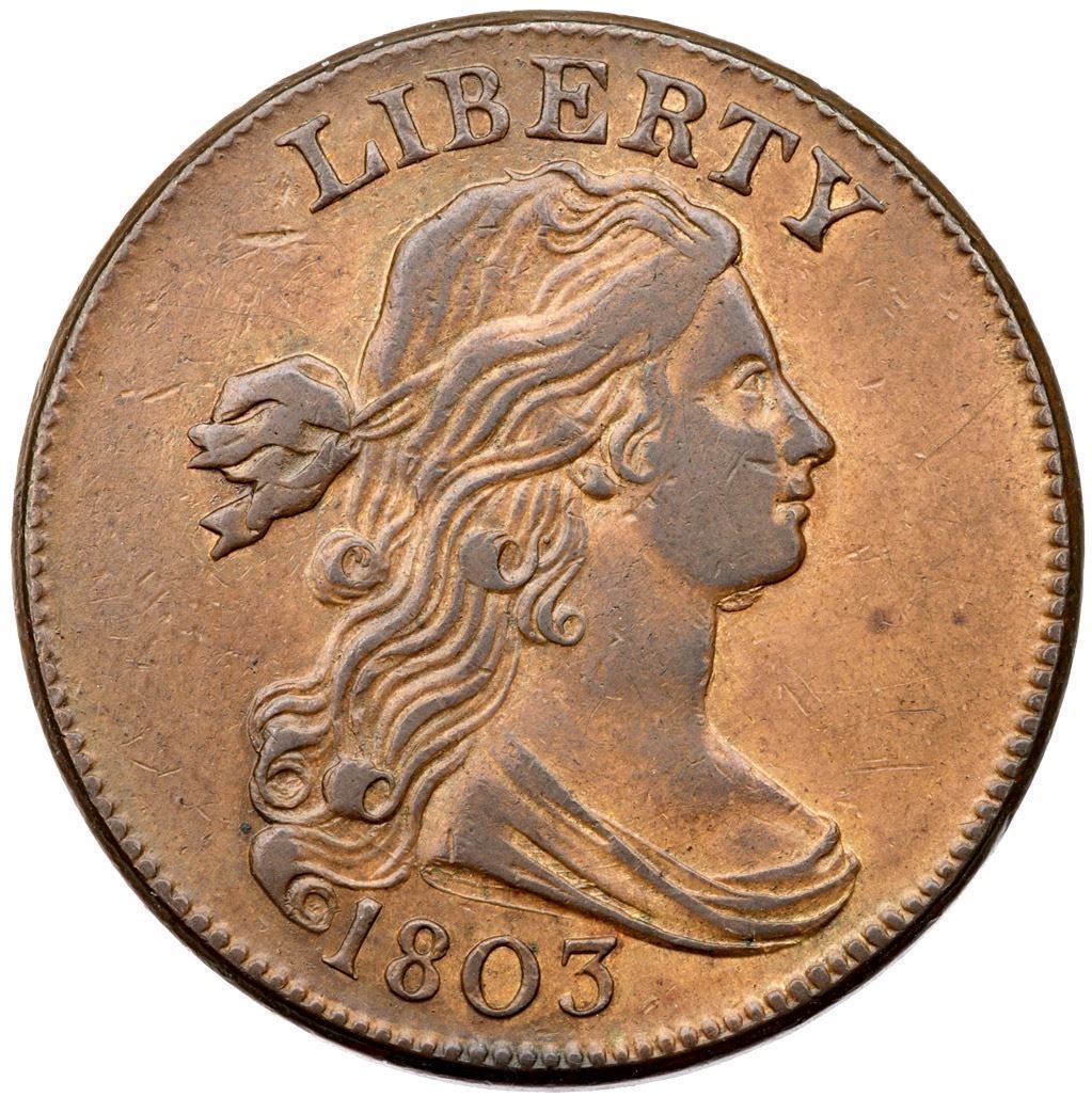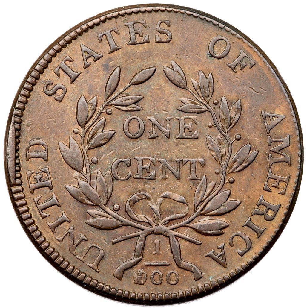 Choice glossy light brown and tan with steel brown toning on the highpoints. A nick-like planchet chip left of the L in LIBERTY and a couple light ticks right of the F in F are the only notable defects. EDS, Breen state II, with a small bulge in the field off the end of the bust and a strong rim cud at ED in UNITED. A beautiful cent, just lightly worn on the devices. The "Mumps" and Corrected Denominator features are obvious. Called EF45 Choice and tied for CC#9 in the Noyes census, his photo #28610. A wonderful example of this "Redbook" variety.