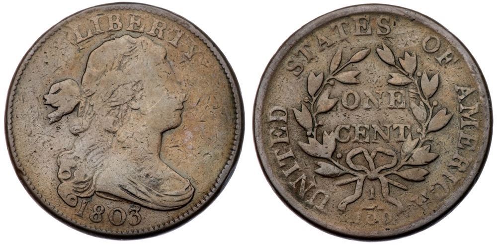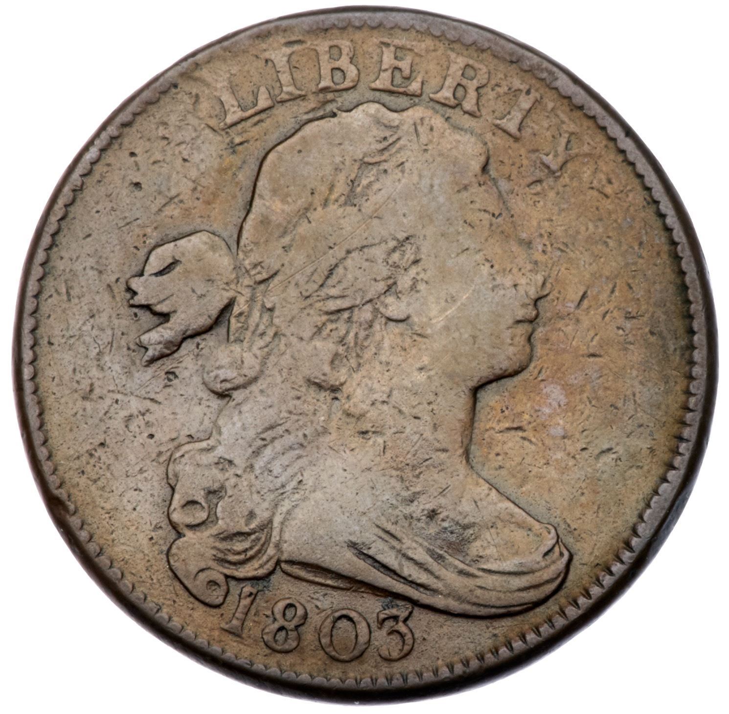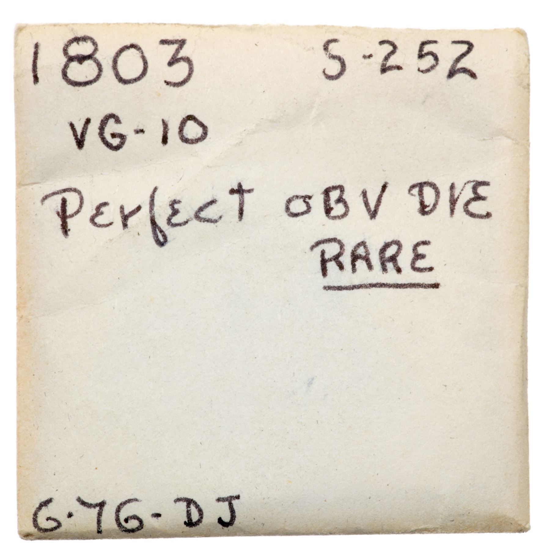 1803 S-252 R-2 VG8VG8+ but there are trivial nicks scattered on both sides, one on the rim at K-8 the most notable. There is also a rim bruise off the bust tip. Rather glossy attractive chocolate brown surfaces, darker brown in some protected areas. EDS, Breen state I.Certificate Number: