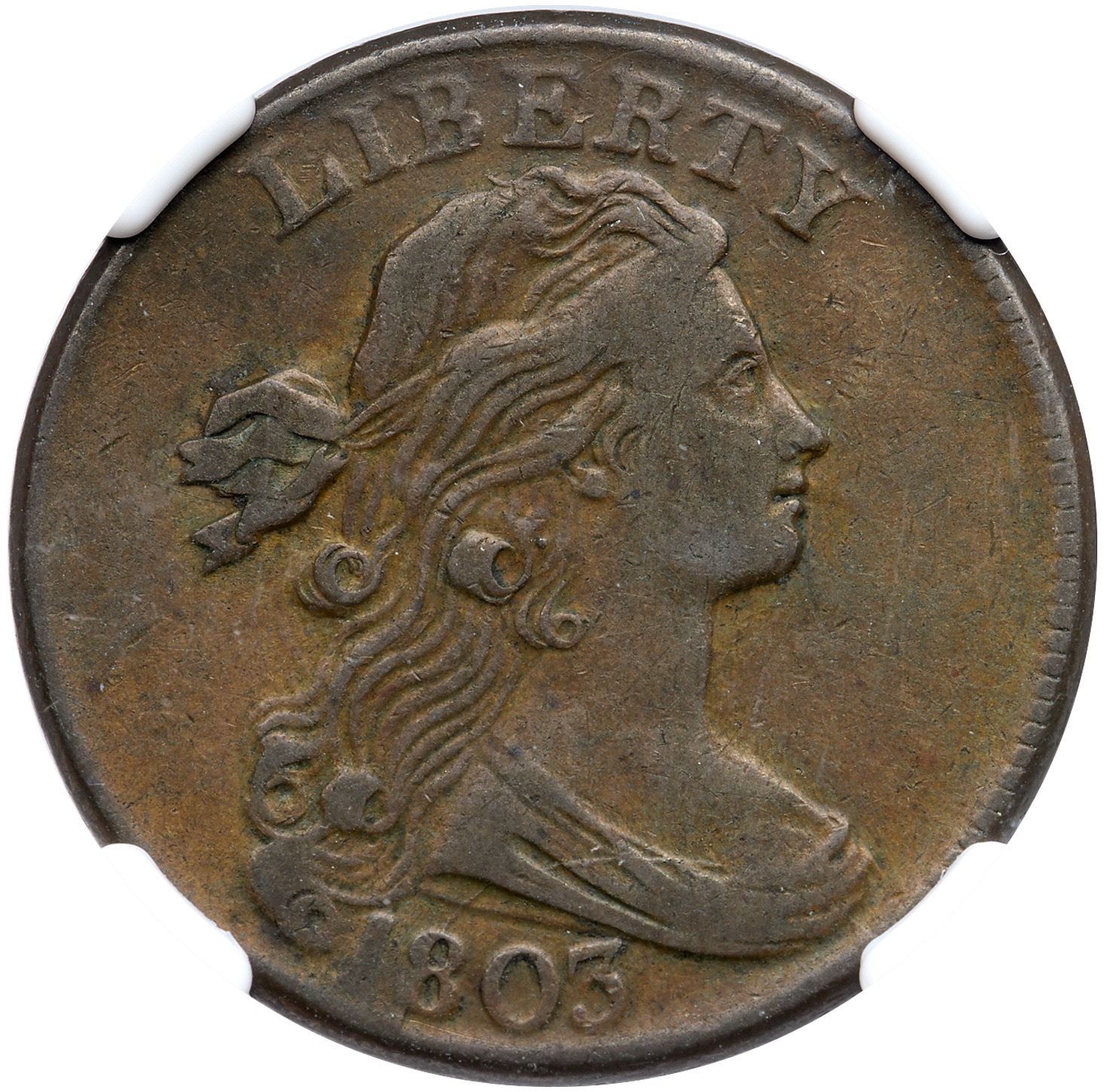 Glossy medium steel brown and light olive with frosty tan in protected areas, particularly on the obverse. Smooth and quite attractive with light wear on the devices and only trivial marks. Two tiny, old scratches left of the eye can help identify this cent, but you need a good glass to find them. M-LDS, Breen state V. The die cracks are stronger, the die is failing at the 1 in the date, and there is a cud break connecting the first T in STATES to the rim (difficult to see in the holder). Our grade is VF35. 5849595-001