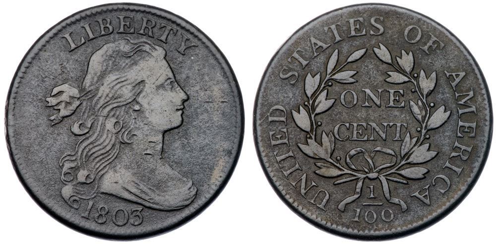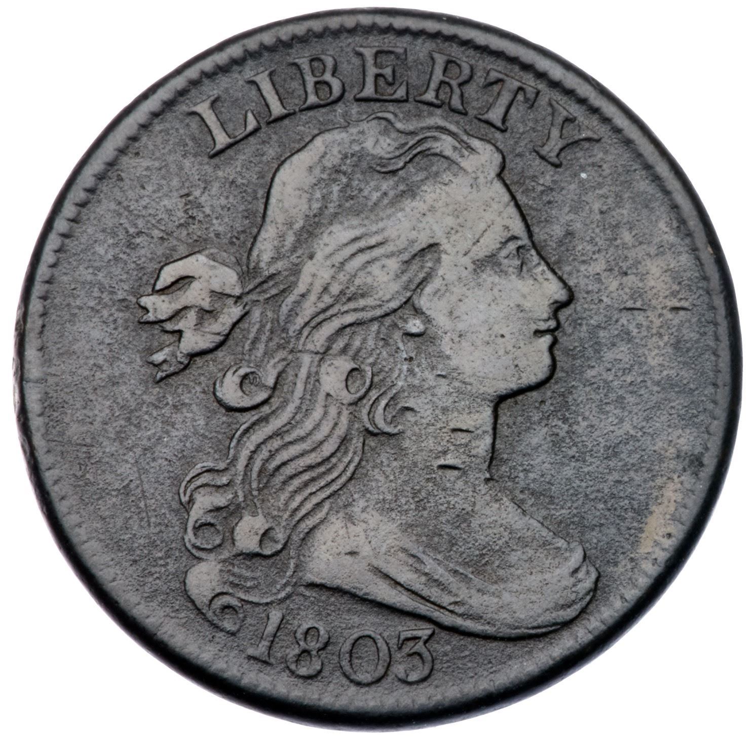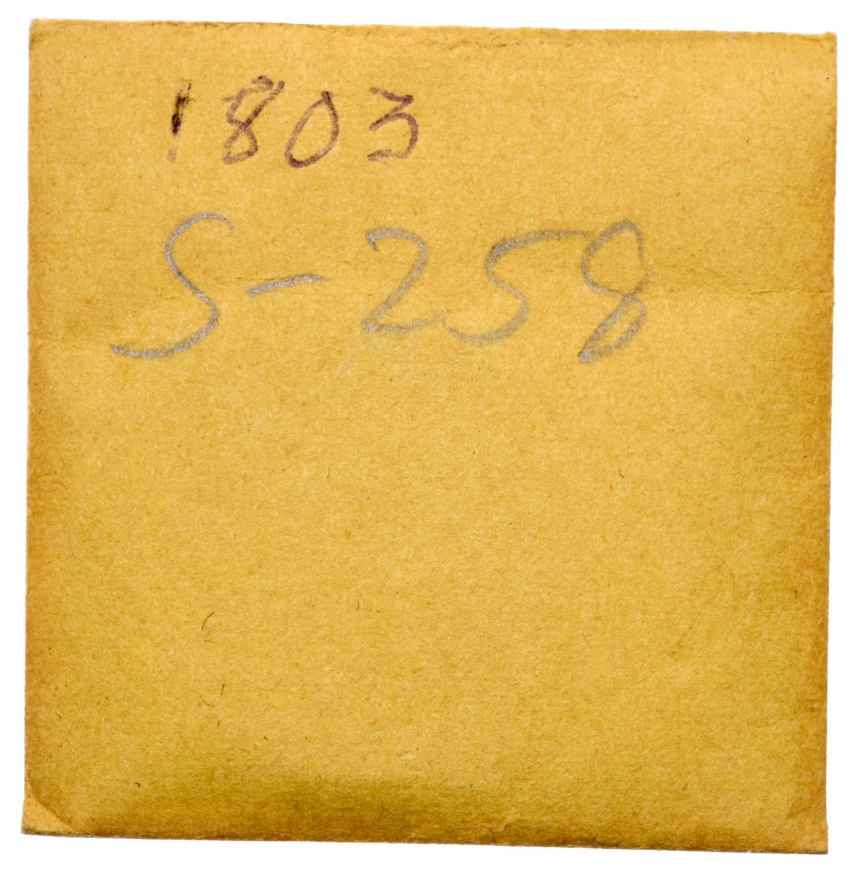 1803 S-258 R-1 VG10VF20 but uniform micro granularity covers all except the highest points of the surfaces. Only a few trivial marks, including a pin scratch above the eye, a pair of ticks on the neck, and another pair of ticks in the field before the mouth. Glossy dark brown surfaces with sharp details. EDS, Breen state I.Certificate Number: