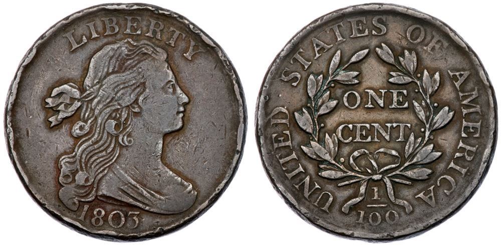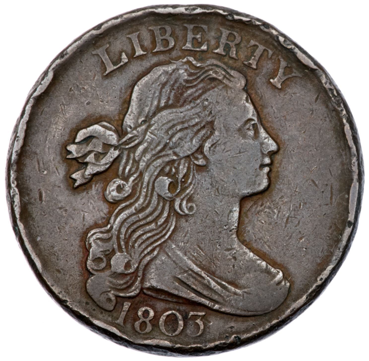 1803 S-259 R-4 Ghost 3 VG10VF25 sharpness but there are numerous rim dents around both sides. Trivial marks otherwise. Glossy medium brown and steel browns with hints of reddish chocolate in some protected areas. Smooth, hard surfaces. MDS, Breen state II.Certificate Number: