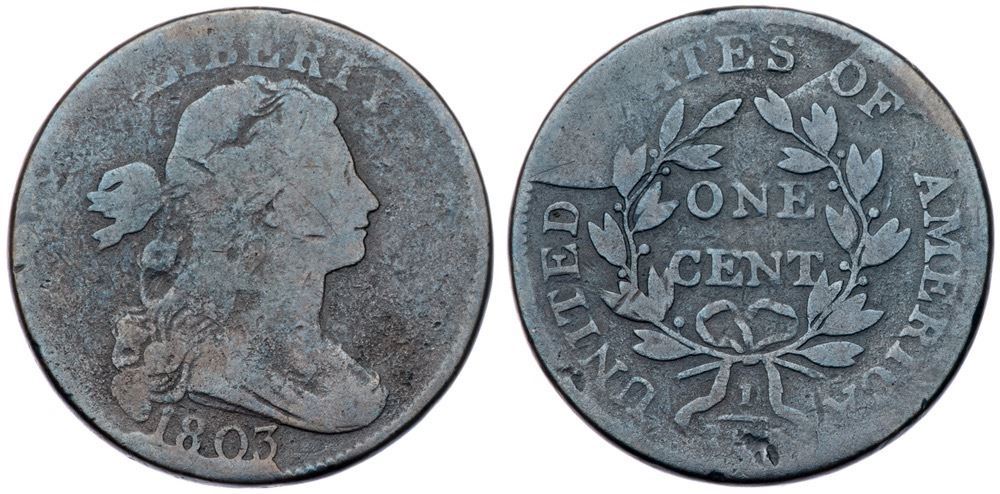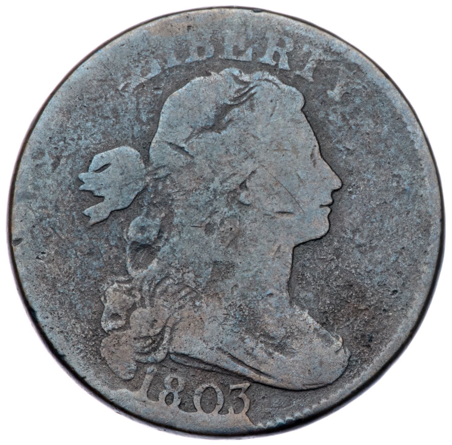 1803 S-263 R-3 G5Mixed chocolate and ebony patina with slightly rough surfaces. There are minor nicks on the denominator and over N in UNITED, otherwise trivial marks. Semi-glossy surfaces. V-LDS, Breen state VIII with the strong rim cud below the date. Certificate Number: