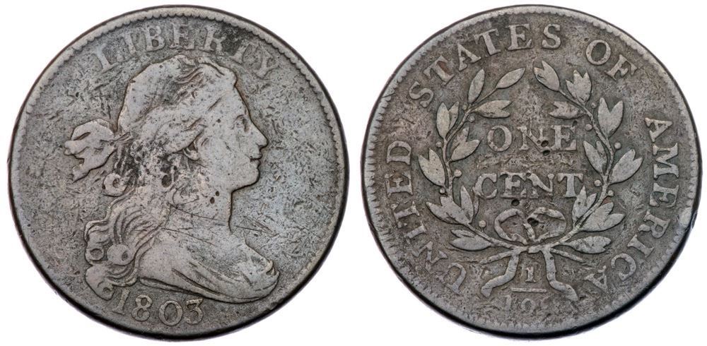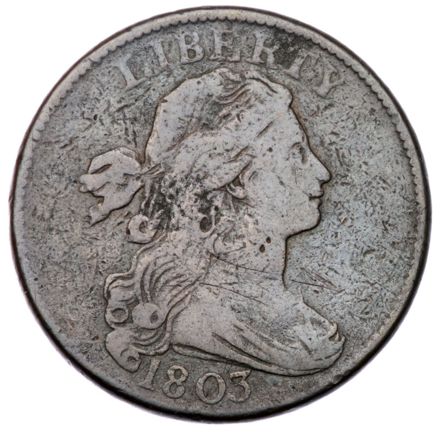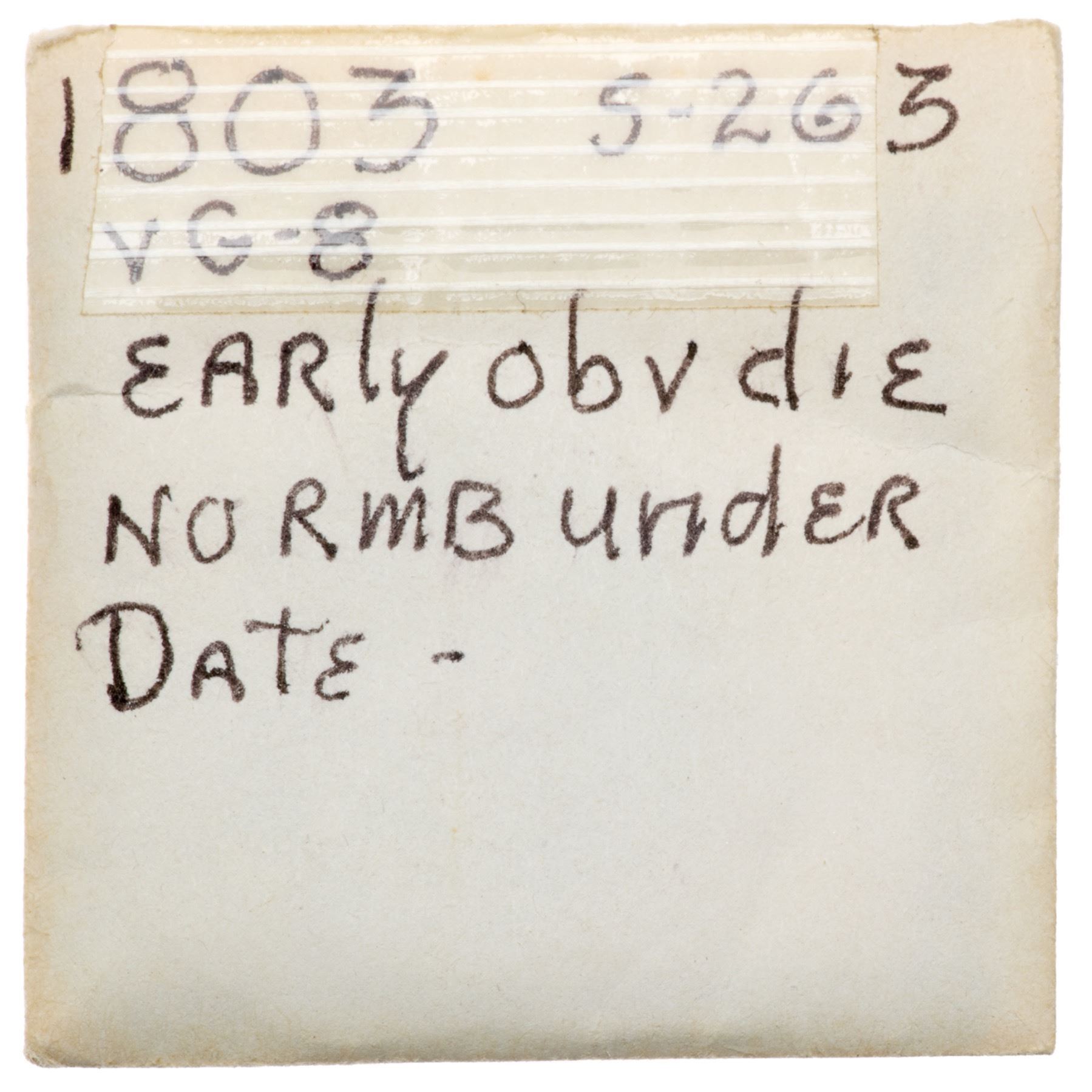 1803 S-263 R-3 VG8VG10+ but there are numerous marks scattered on both sides. The most notable include a couple pin scratches on the lower neck and a handful of deeper pin pricks on the central reverse. Glossy dark olive brown surfaces. Strong date and legends. E-MDS, Breen state III.Certificate Number: