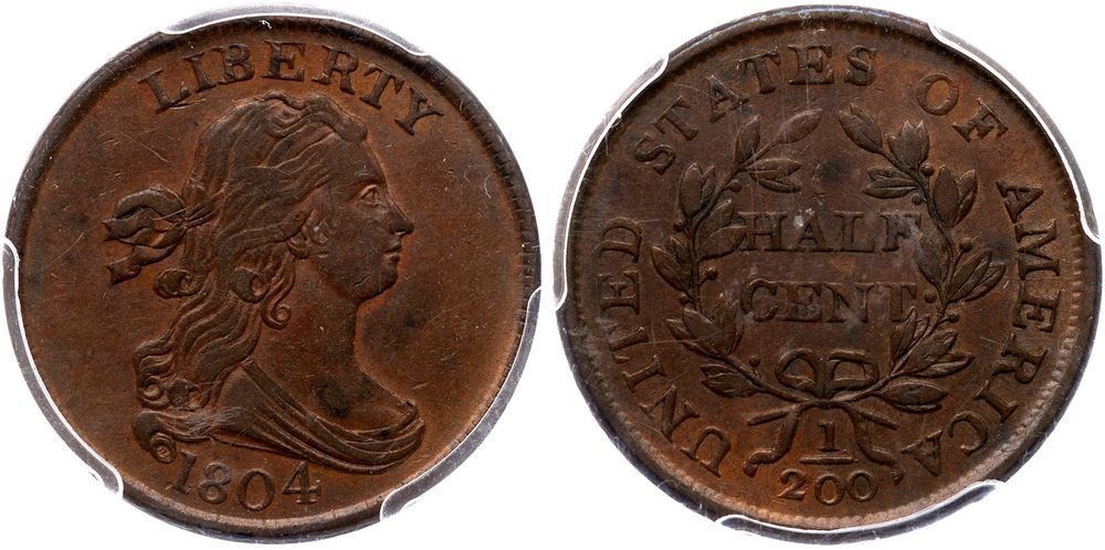 Frosty steel brown with tan in protected areas, particularly on the obverse. Peeps of mint luster show in protected areas, especially on the reverse. The only marks are a couple thin nicks in the field above the hair ribbon and a small puff of darker olive brown toning on the bust. Just a light touch of friction on the highpoints of the devices and the eye appeal of this half cent is excellent. Scarce EDS, Manley state 1.0, Fuhrman state 1, with a light die crack arcing from the second T in STATES to the right side of the M in AMERICA (this crack occurred during the die's earlier use during the 1803 C-3 die pairing). Our grade is AU50. A high condition census example of a variety that is seldom found in grades above VF. Only a single mint state example is known, and it has an ugly stain on the obverse (Missouri Cabinet Collection, McCawley & Grellman Auctions/Goldbergs 1/26/2014:59 which brought $21,850). The attribution is noted on the PCGS label. (The slab is scuffed on the reverse.)
